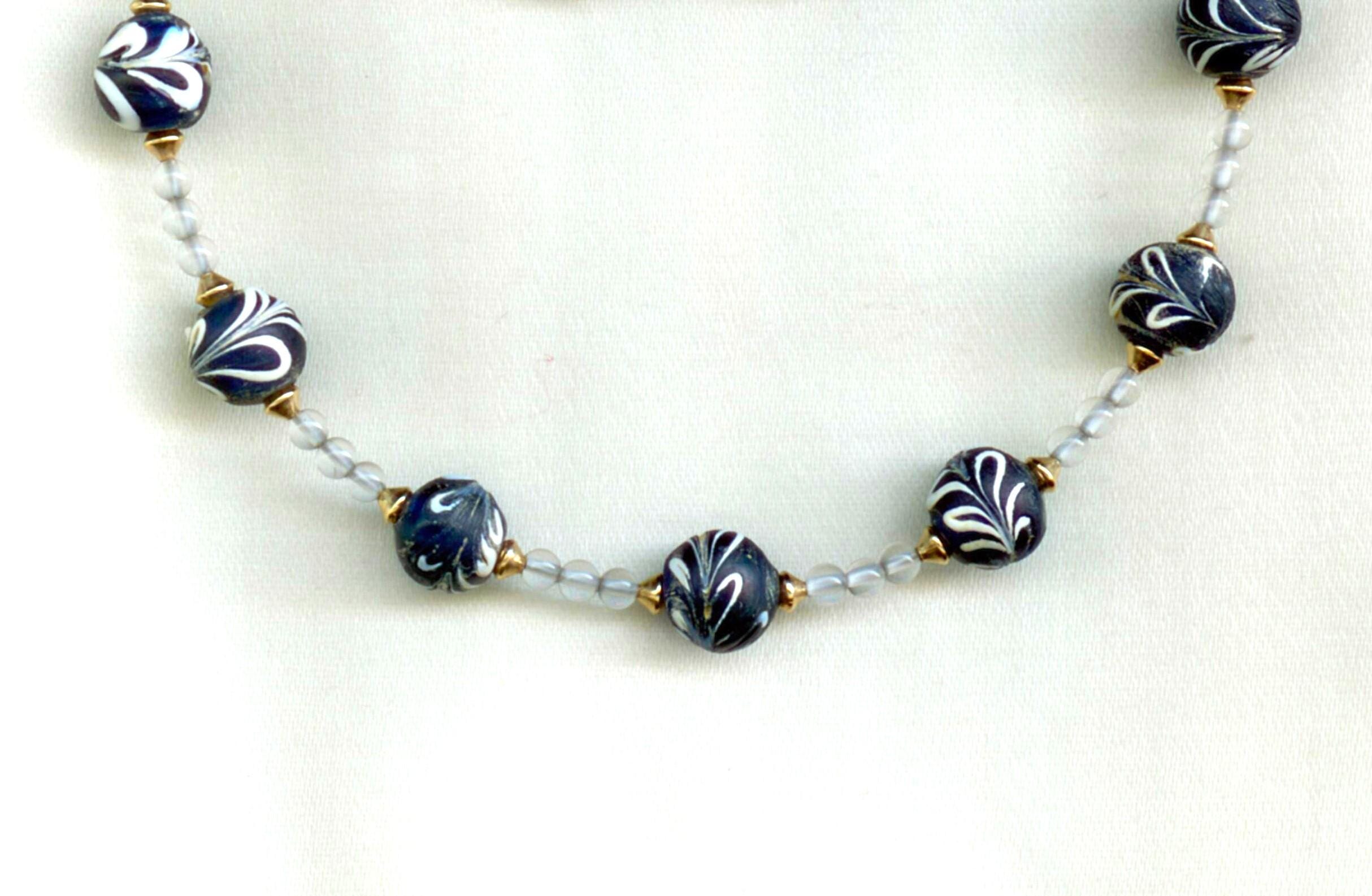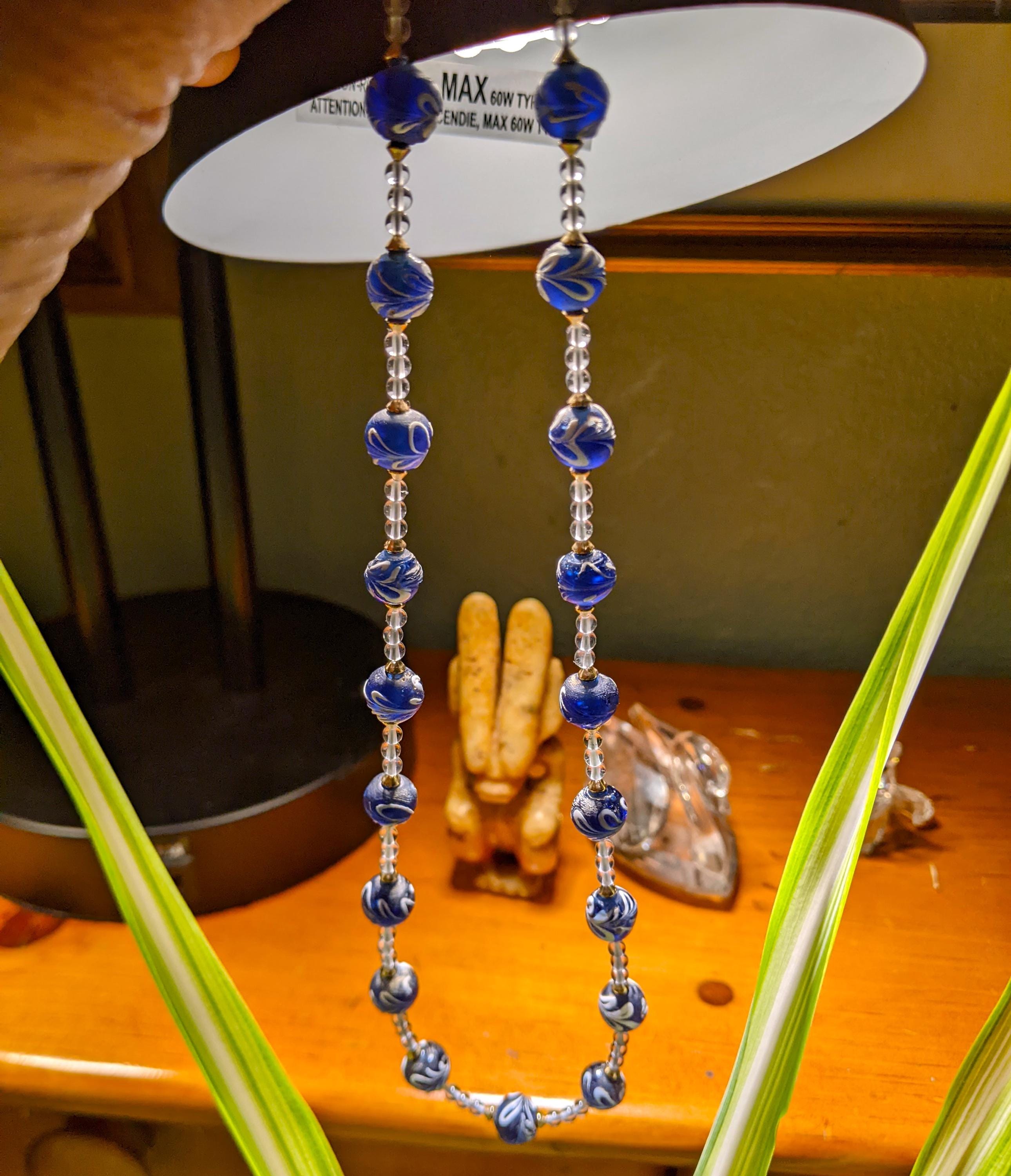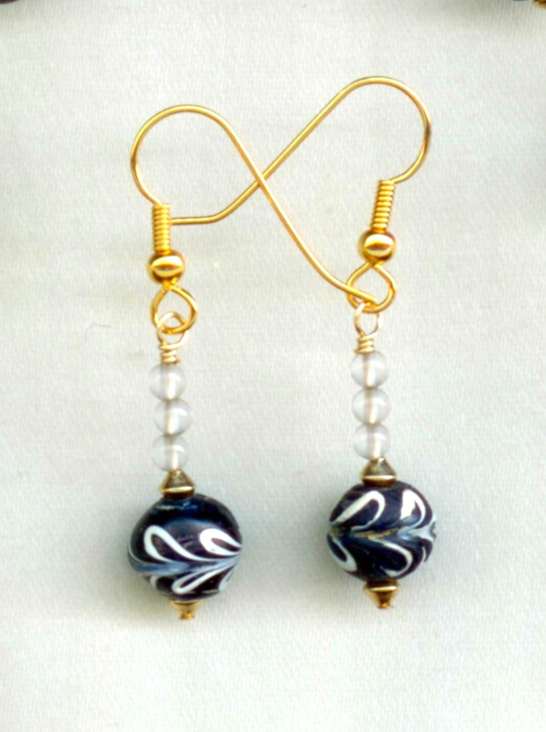 Beautiful, decorated glass beads, probably 18th Century from Northern Europe. Very delicate and refined glasswork. The beads reveal a lovely, translucent blue color when held to the light. Strung with modern quartz crystal and gold filled beads. The clasp and the ear wires are PermaGold, a highly durable 14k gold plate.
