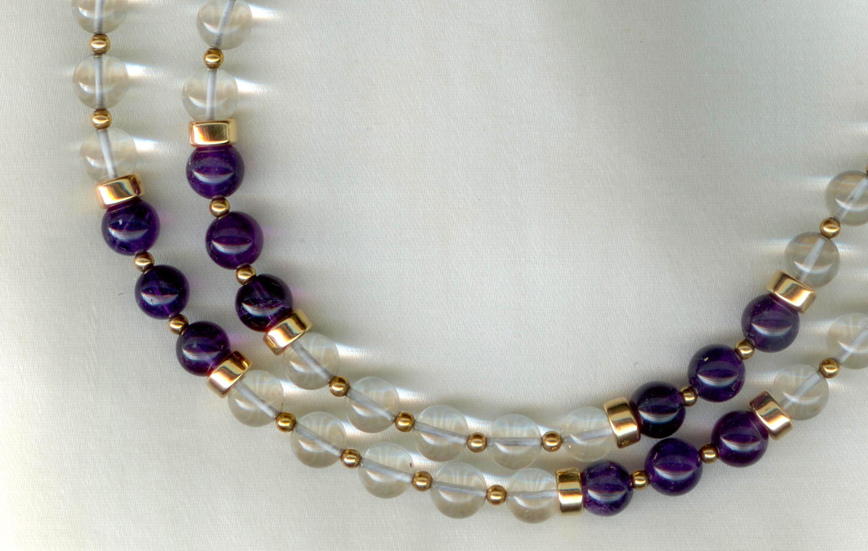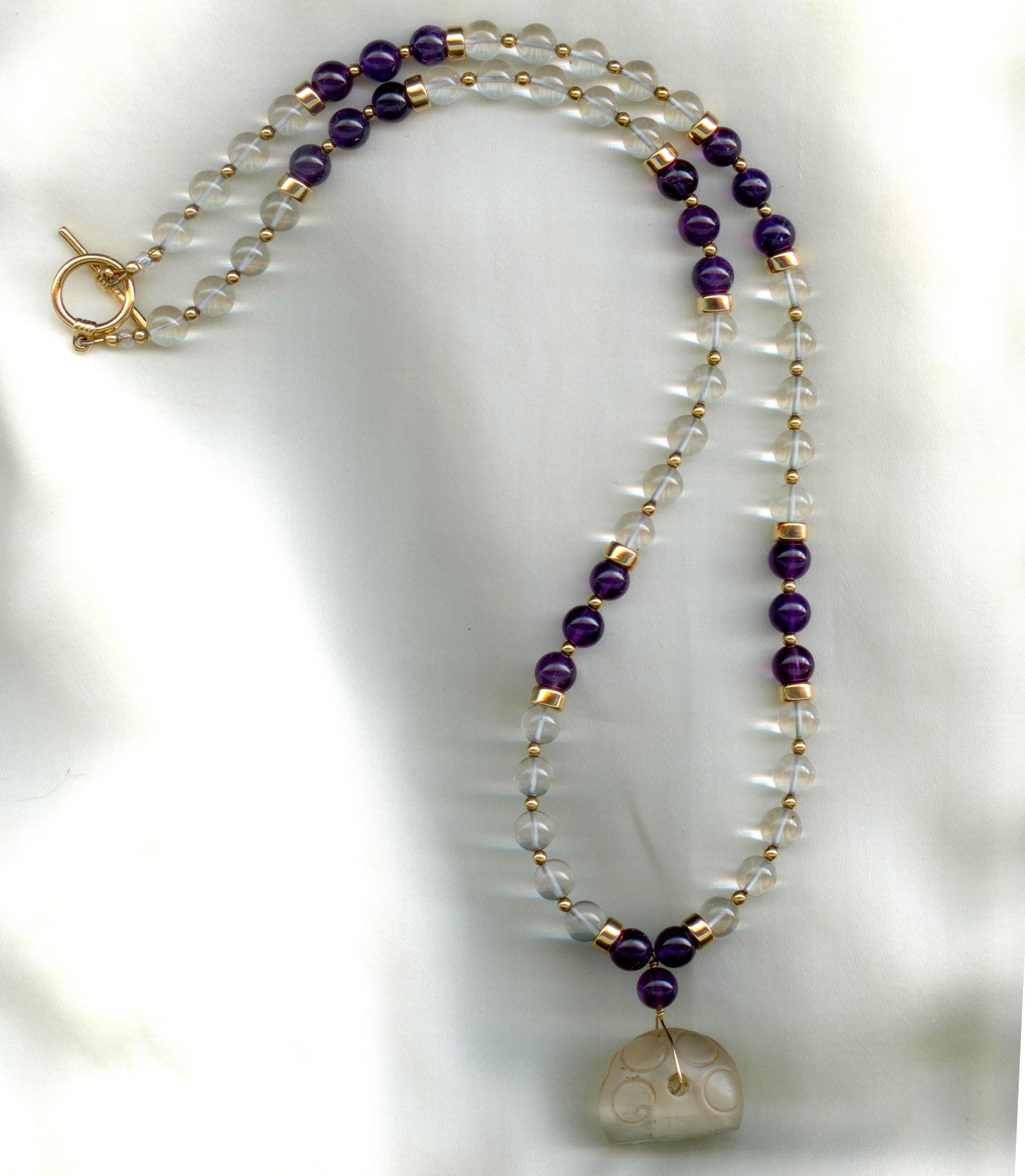 Strung with modern quartz crystal, amethyst and gold filled beads. The clasp is PermaGold, a highly durable 24 kt gold plate with an anti-tarnish coating. Length: 25.5"