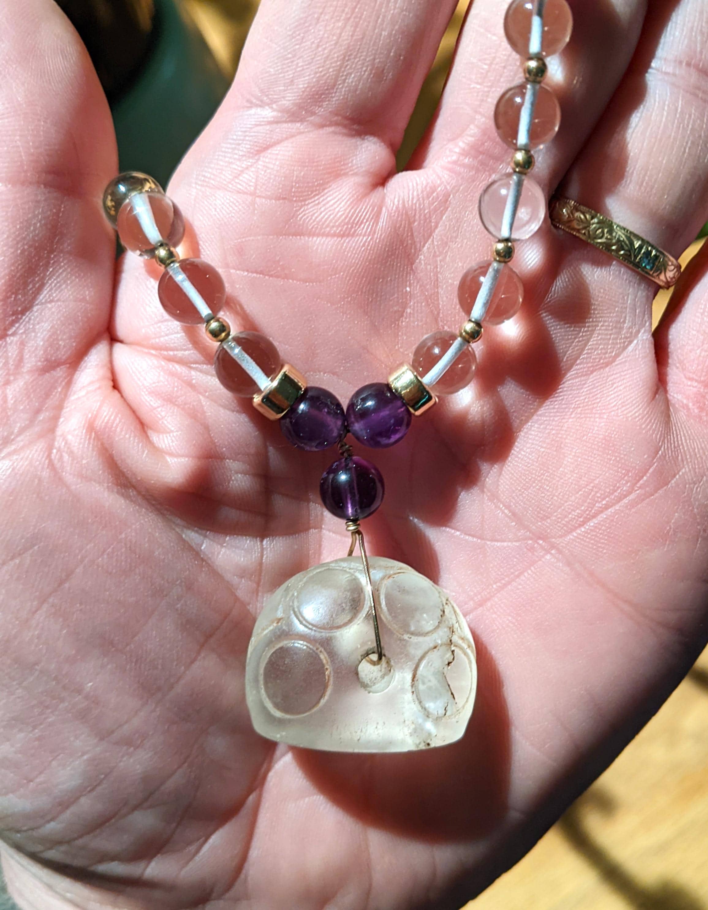 The centerpiece of this necklace is a carved quartz crystal seal from the Sasanian Empire, traditionally dated from 224 to 651 AD. The image is a quadruped animal looking backwards.