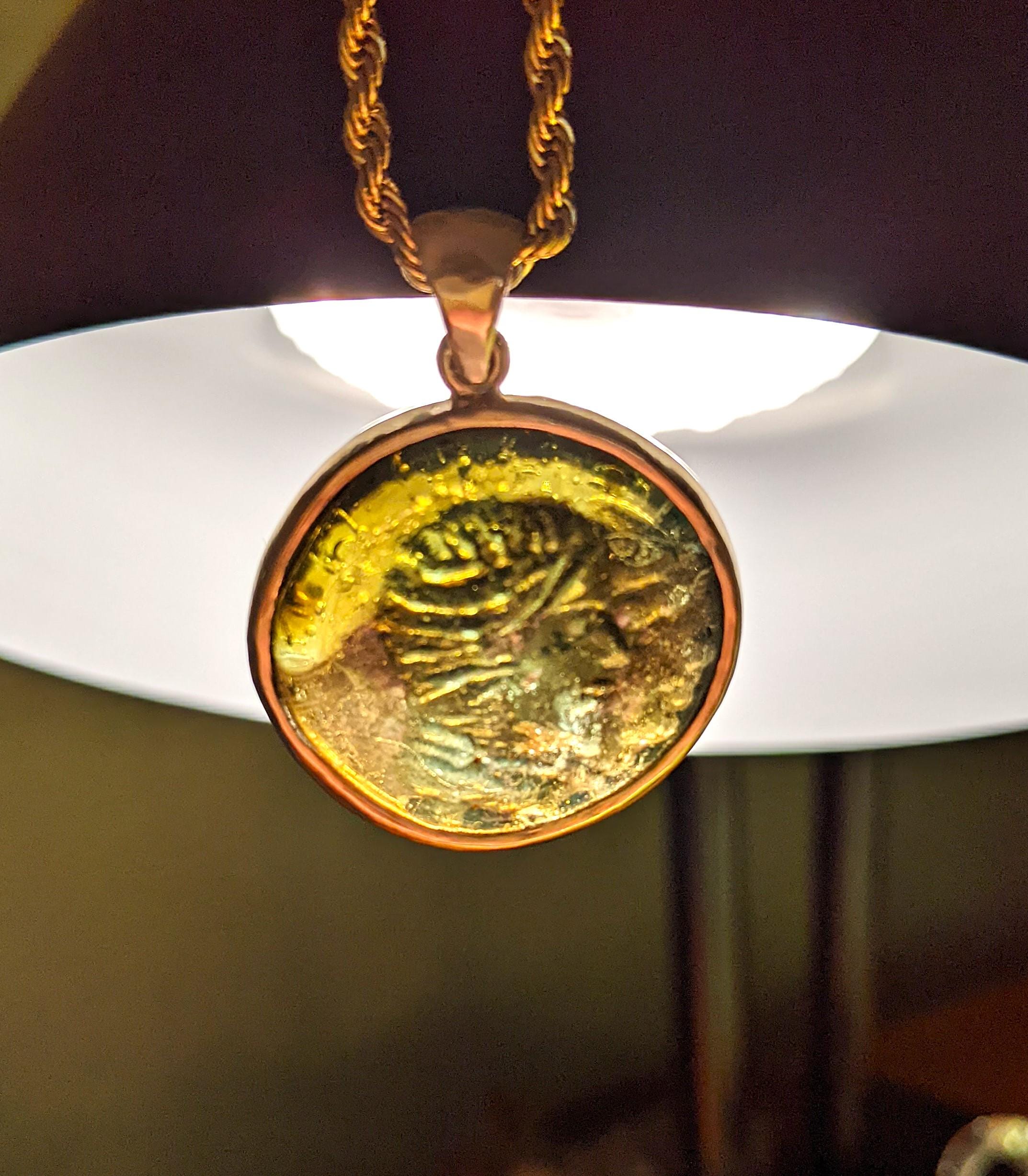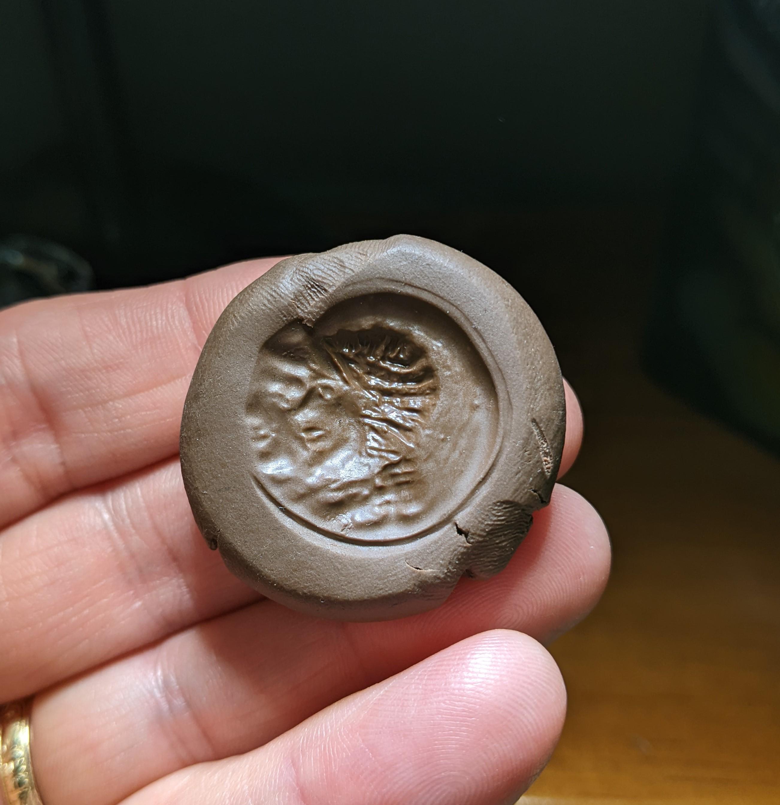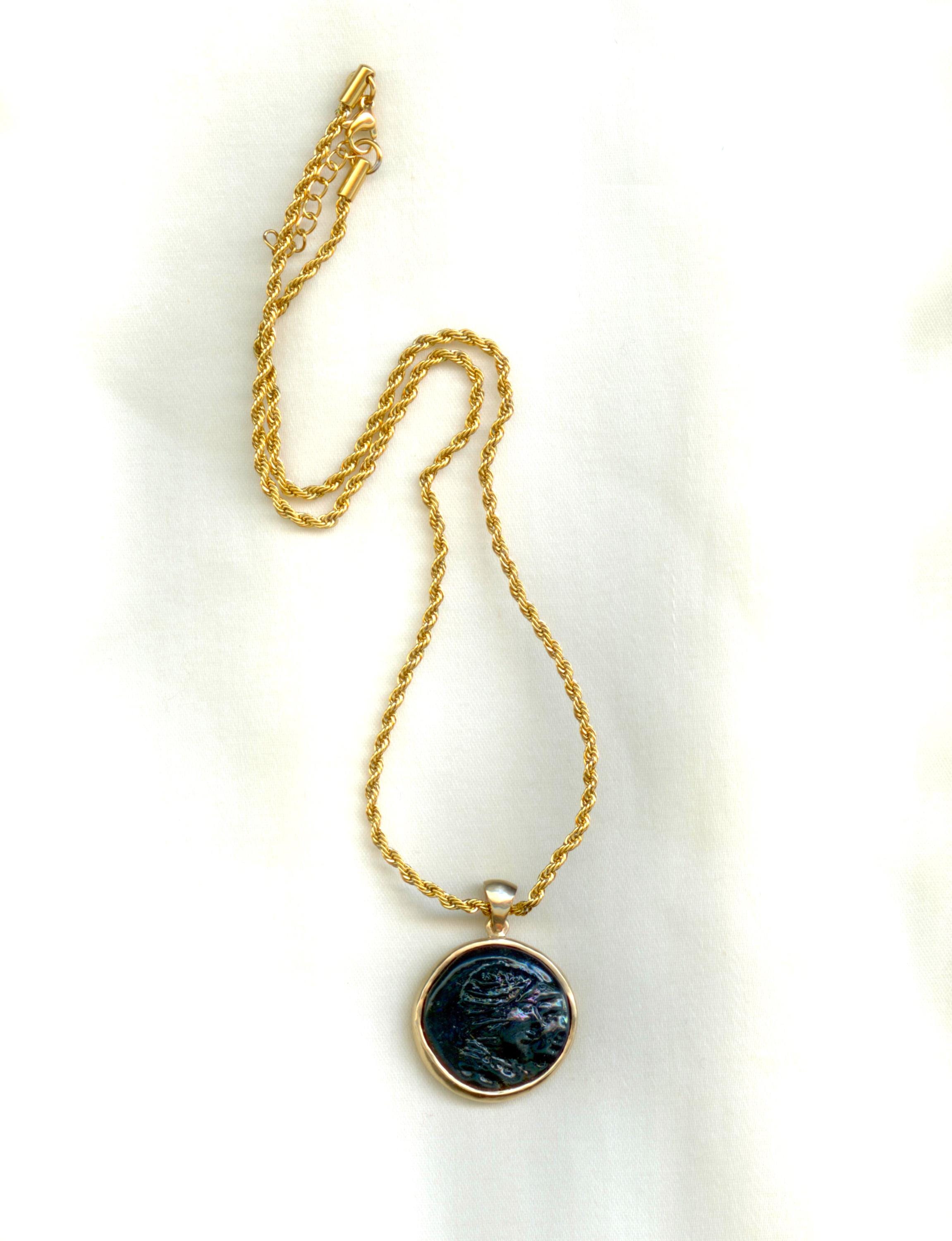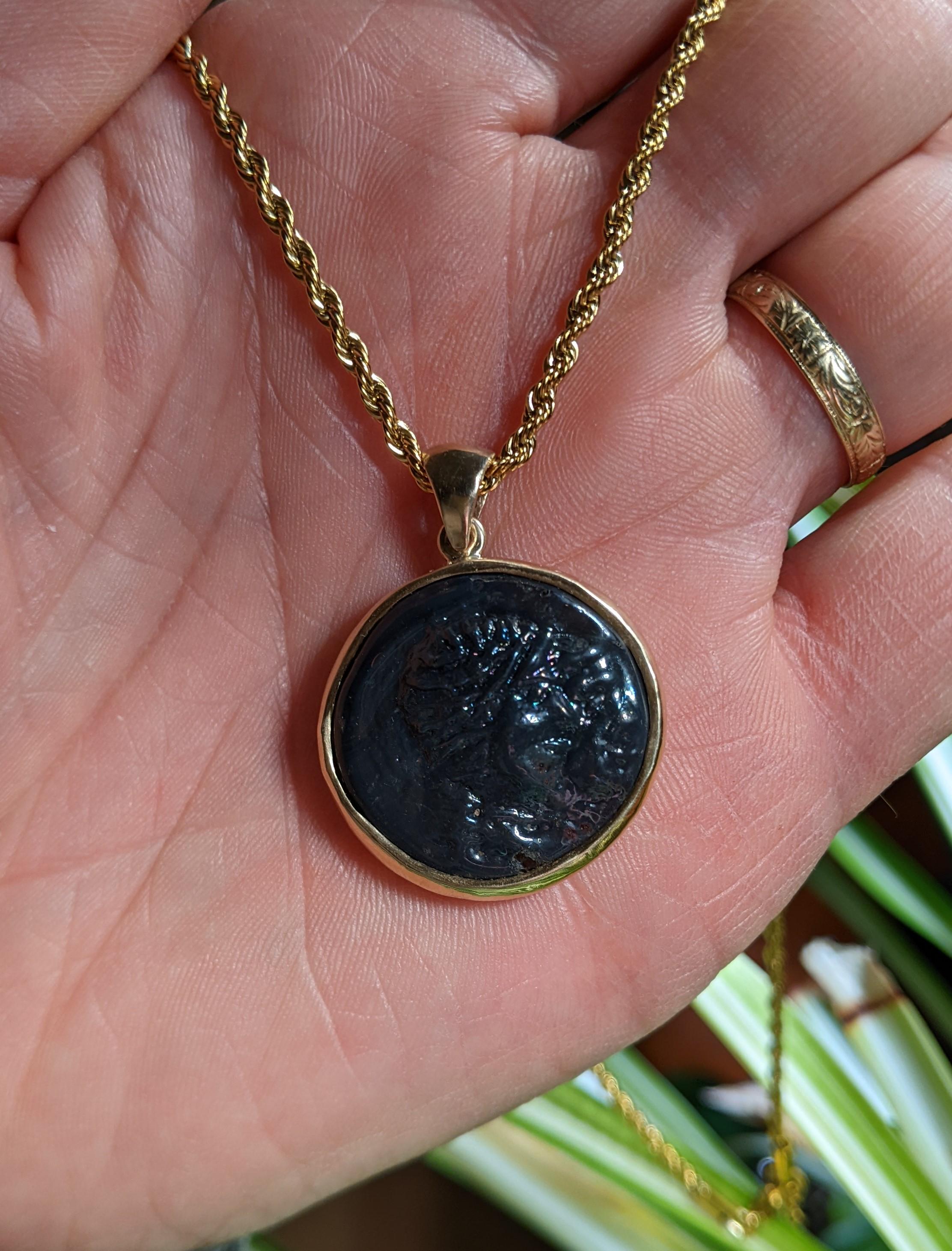 Roman glass coin weight, 1st - 3rd centuries AD. This example has a portraits of Castor & Pollux, figures from Greek and Roman mythology. It was used as a weight to measure the gold aureus coin from the same era.
