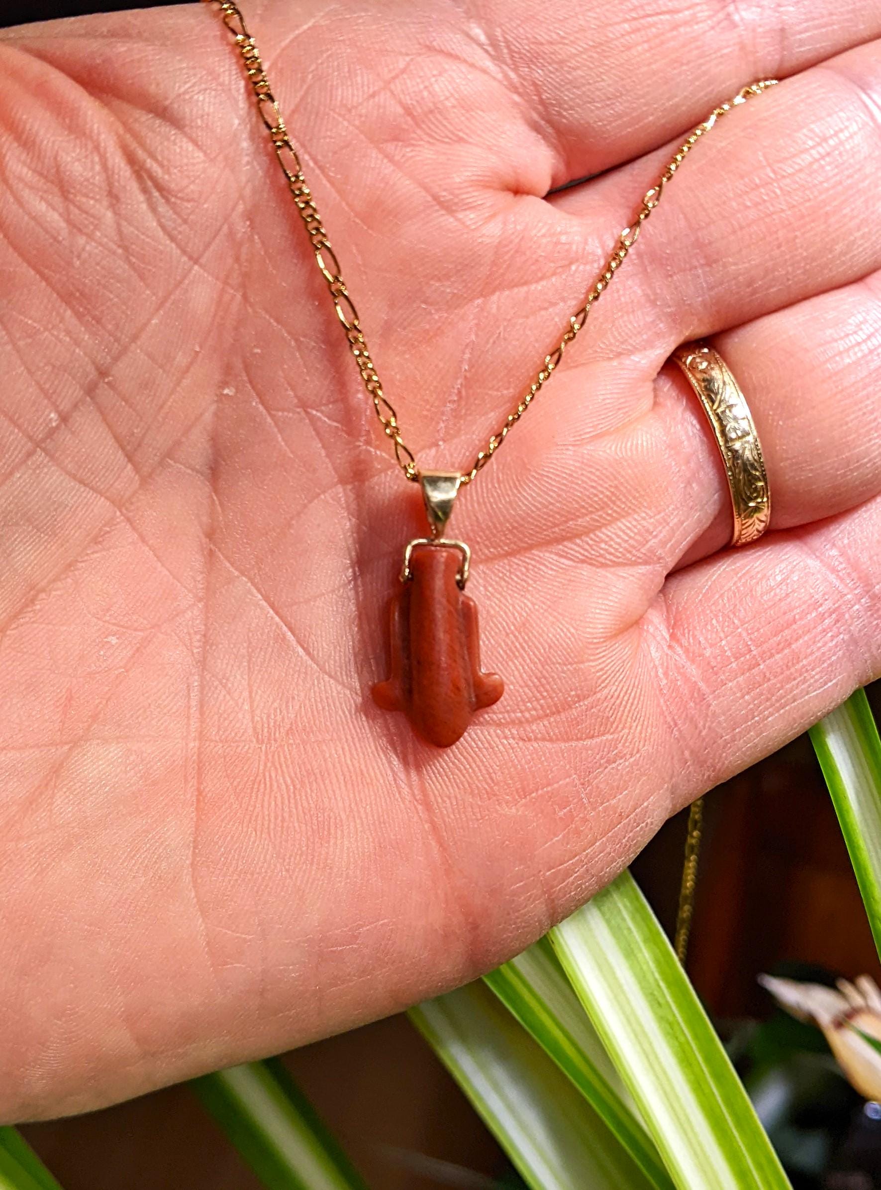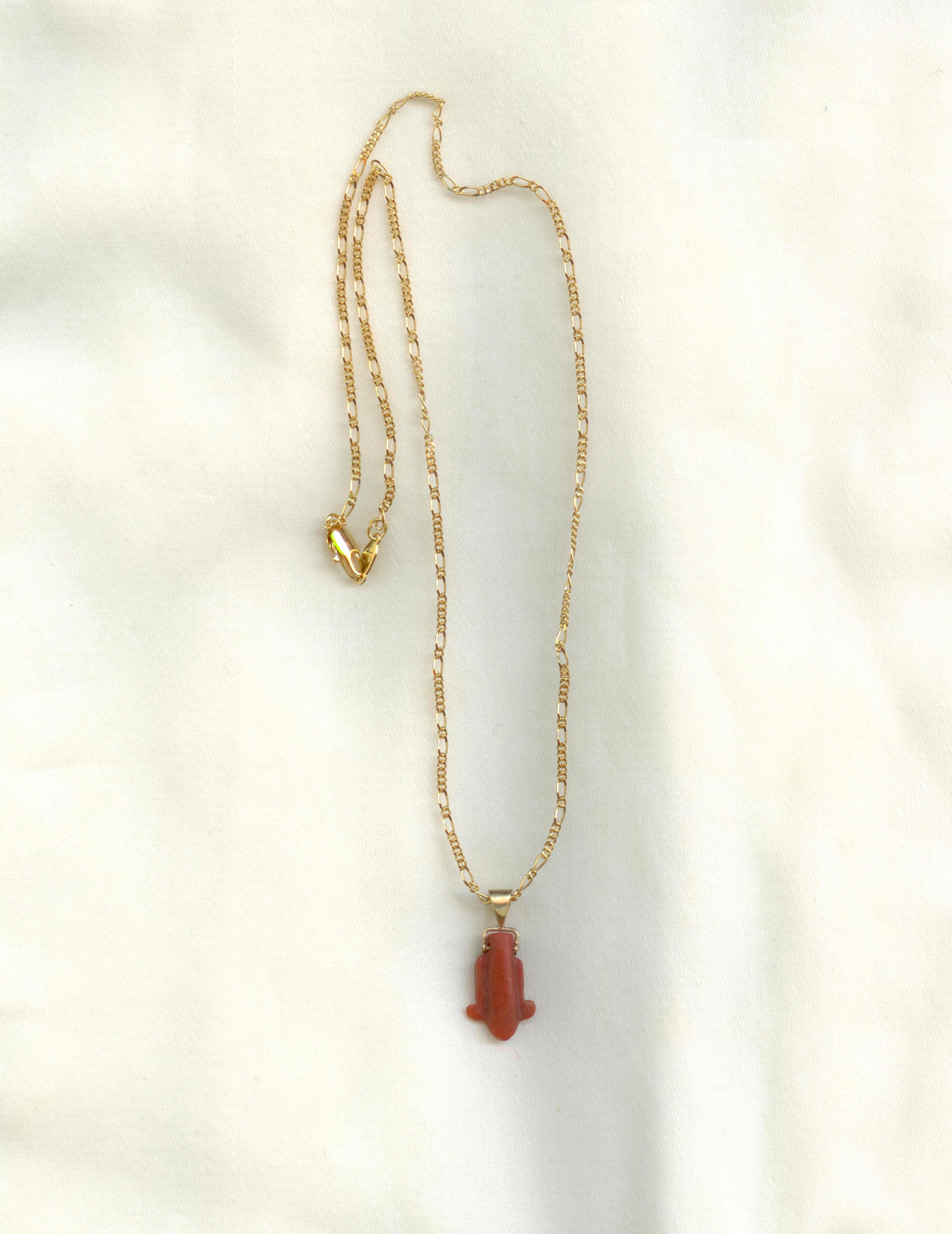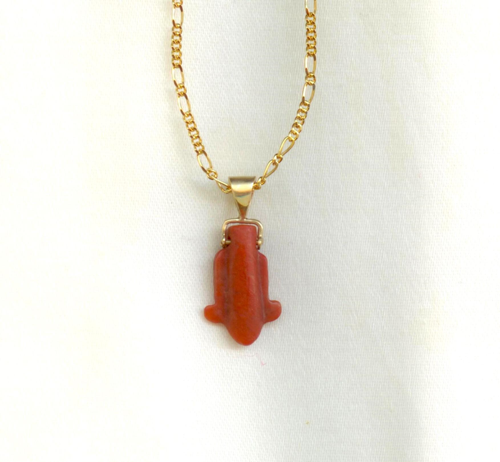 Here is a very lovely pendant bead from ancient Egypt in the shape of a lotus flower. Made of a red stone, possibly jasper. It dates to the New Kingdom period circa 1,250 BC.The setting is 14 kt gold. The chain is a high end gold plate. Length: 18"