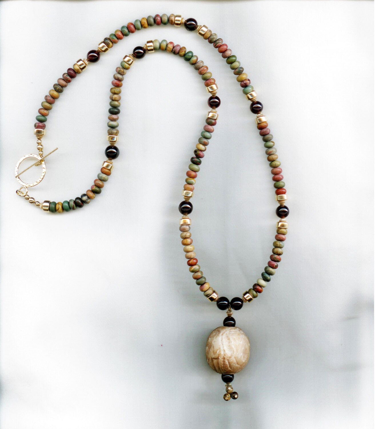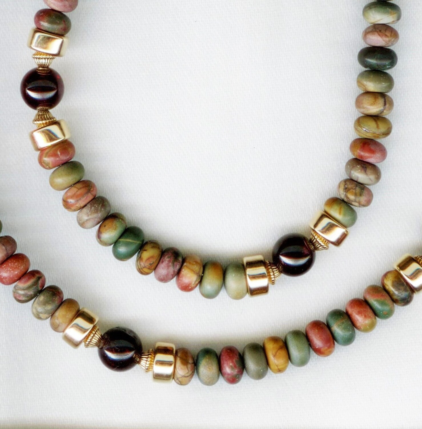 Strung with modern jasper, garnet and gold filled beads. The clasp is gold filled.
