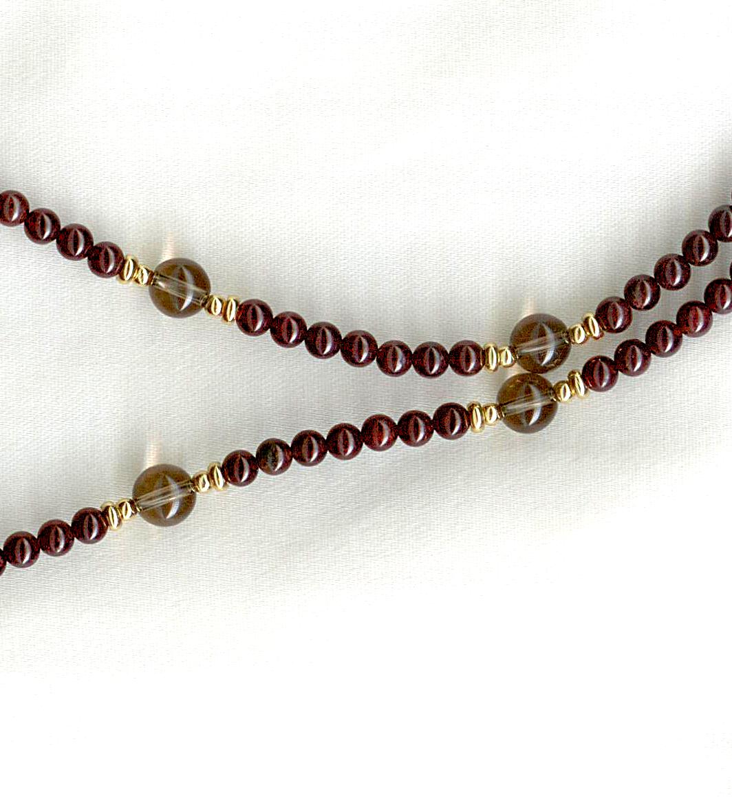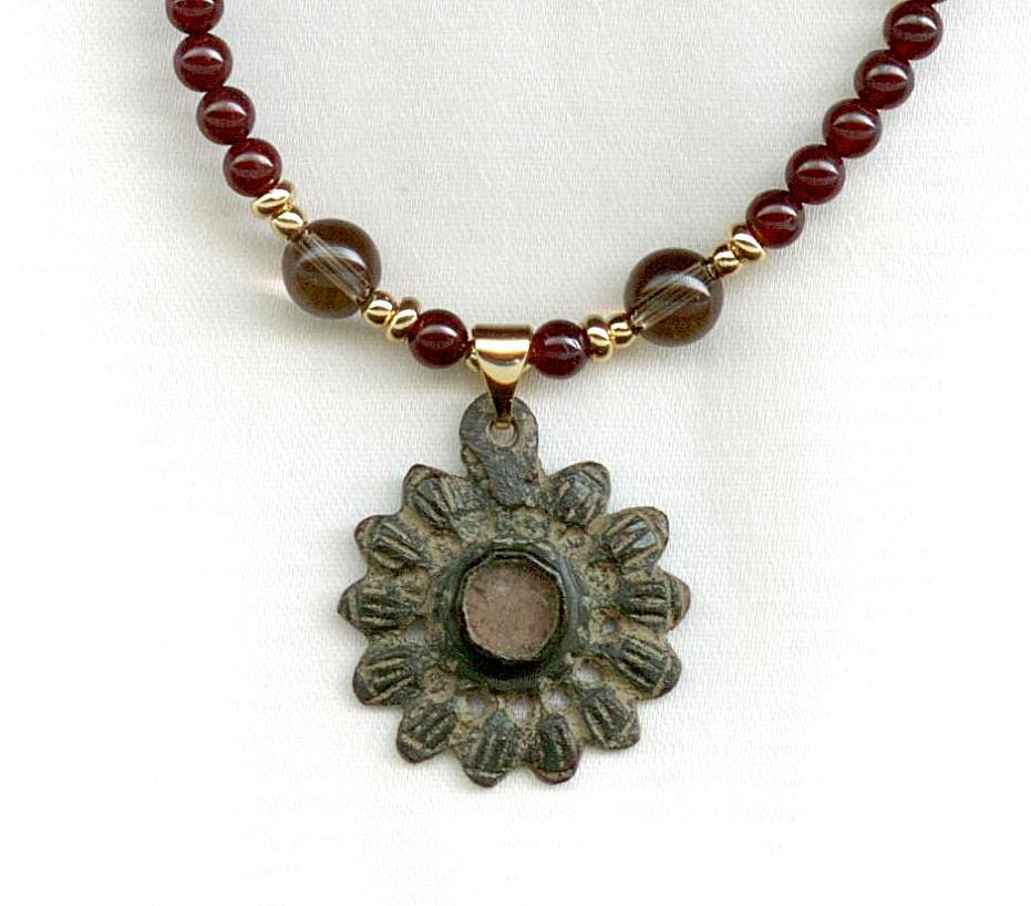 The centerpiece of this necklace is a lovely, bronze earring with reddish glass center decoration from the Southern European Medieval era. Strung with modern garnet, smoky quartz and gold filled beads. Length: 17.5"