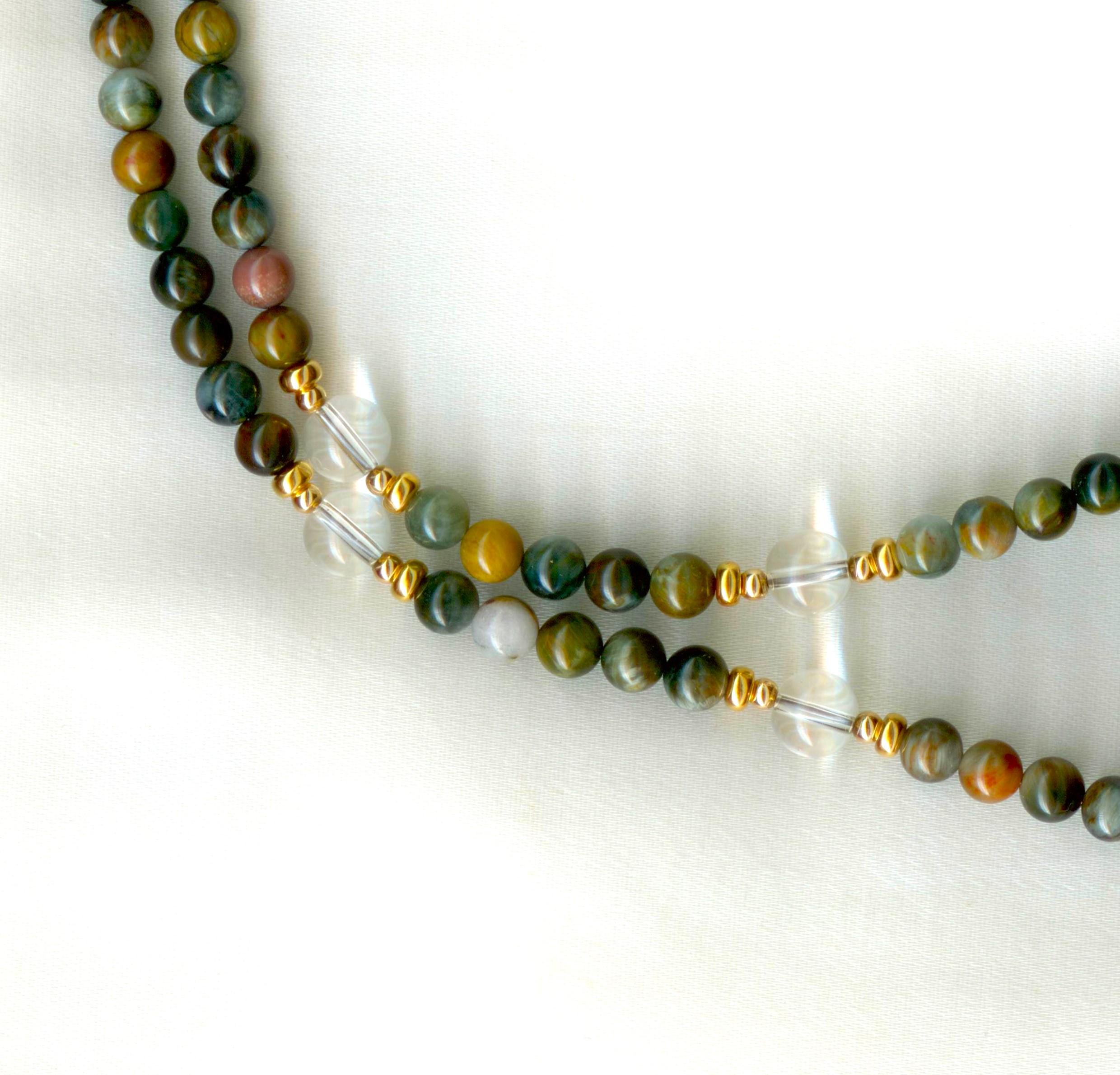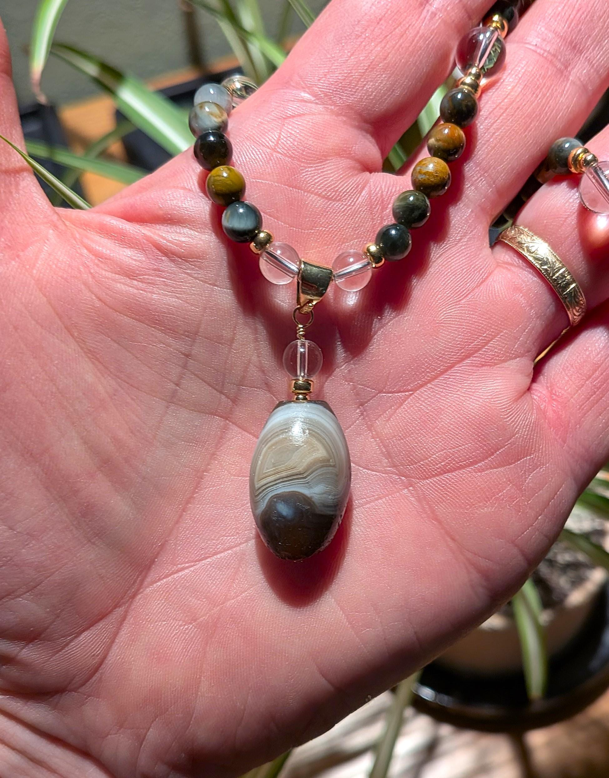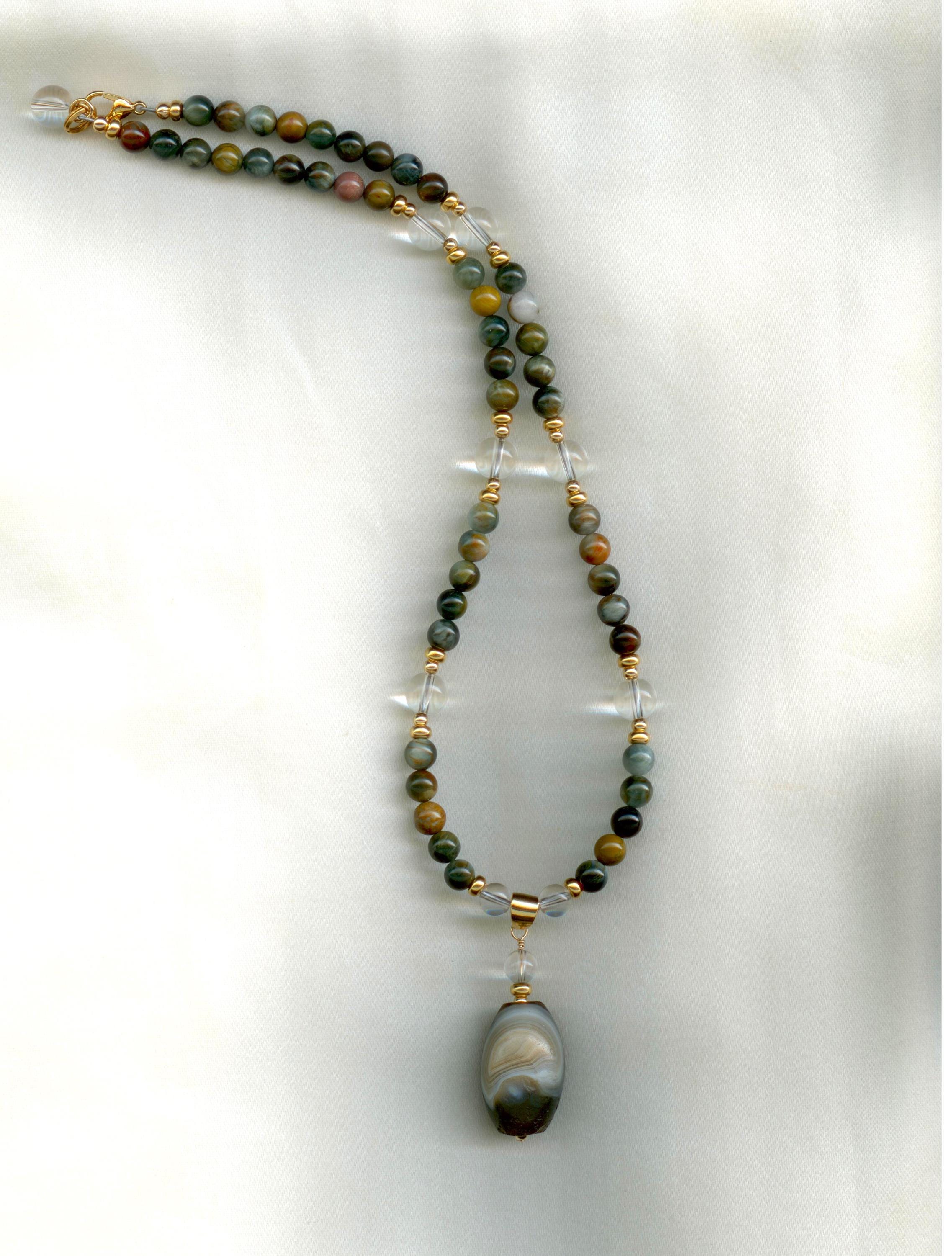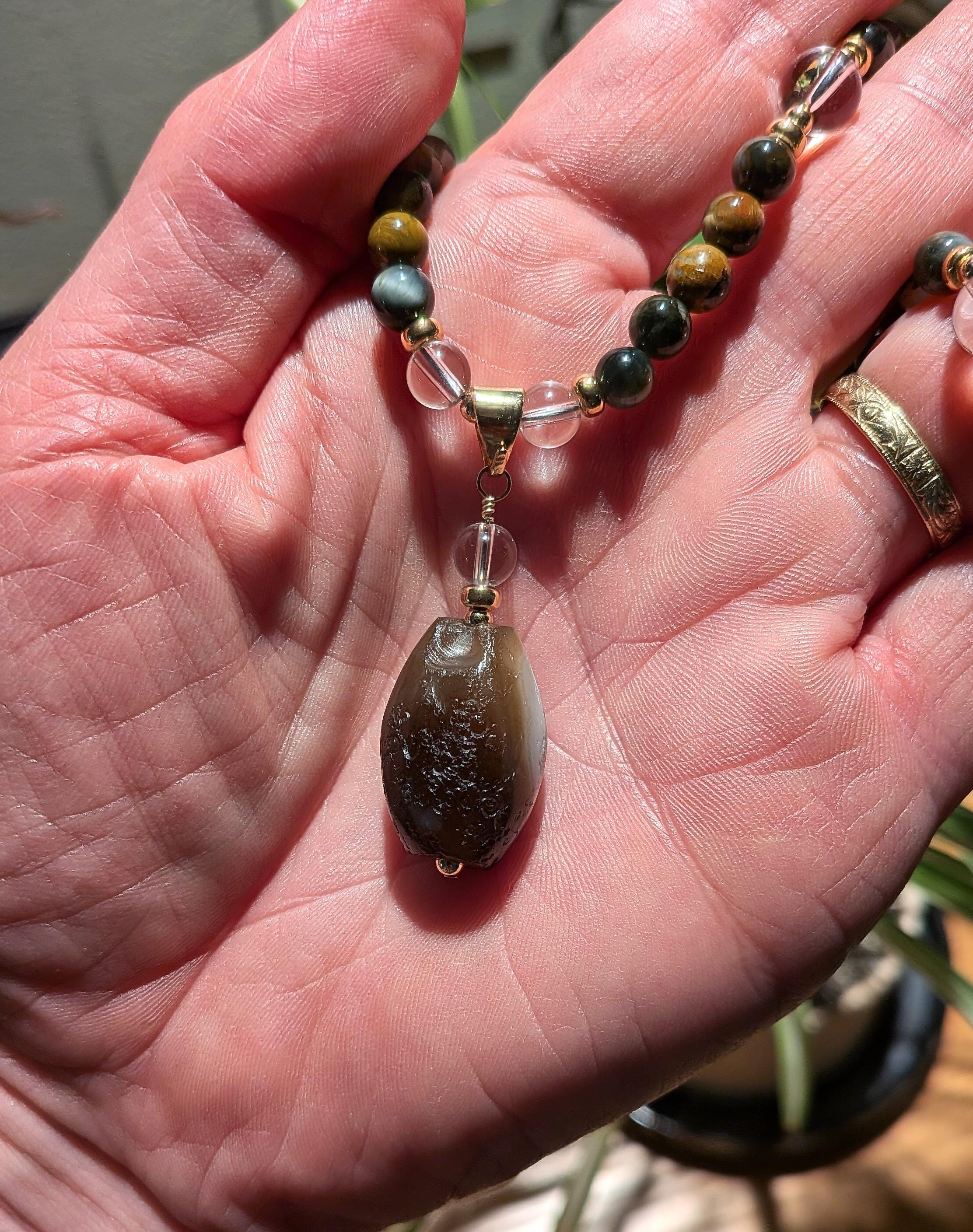 Strung with modern Eagle Eye jasper, quartz crystal and gold filled beads. The bail is also gold filled. Length: 17.5".