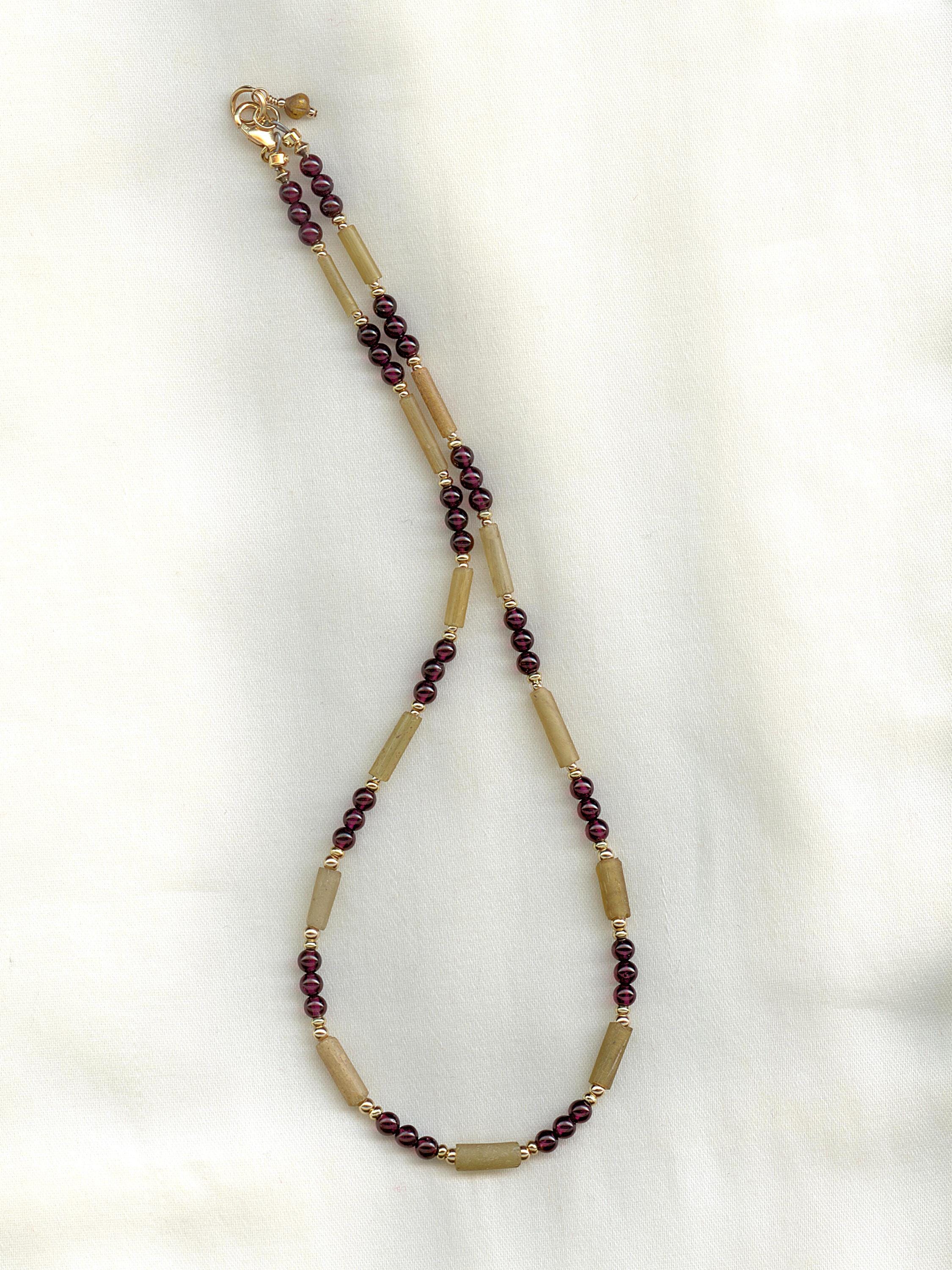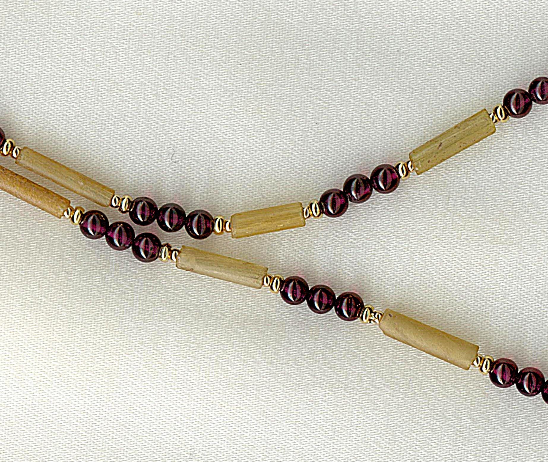 Gold colored glass from the Roman Era 100-400 AD.Strung with modern garnet and gold filled beads & clasp.Length: 17"