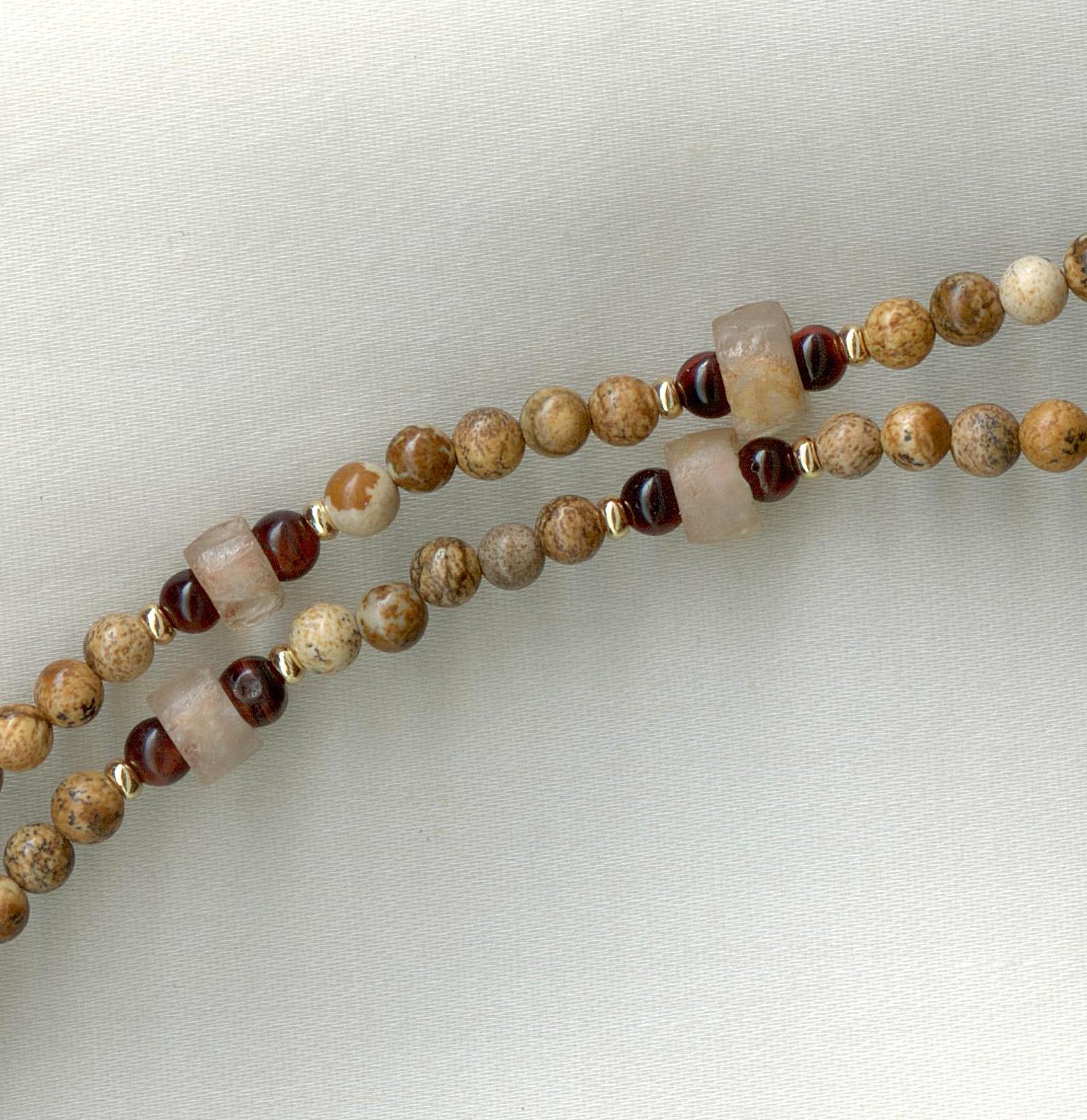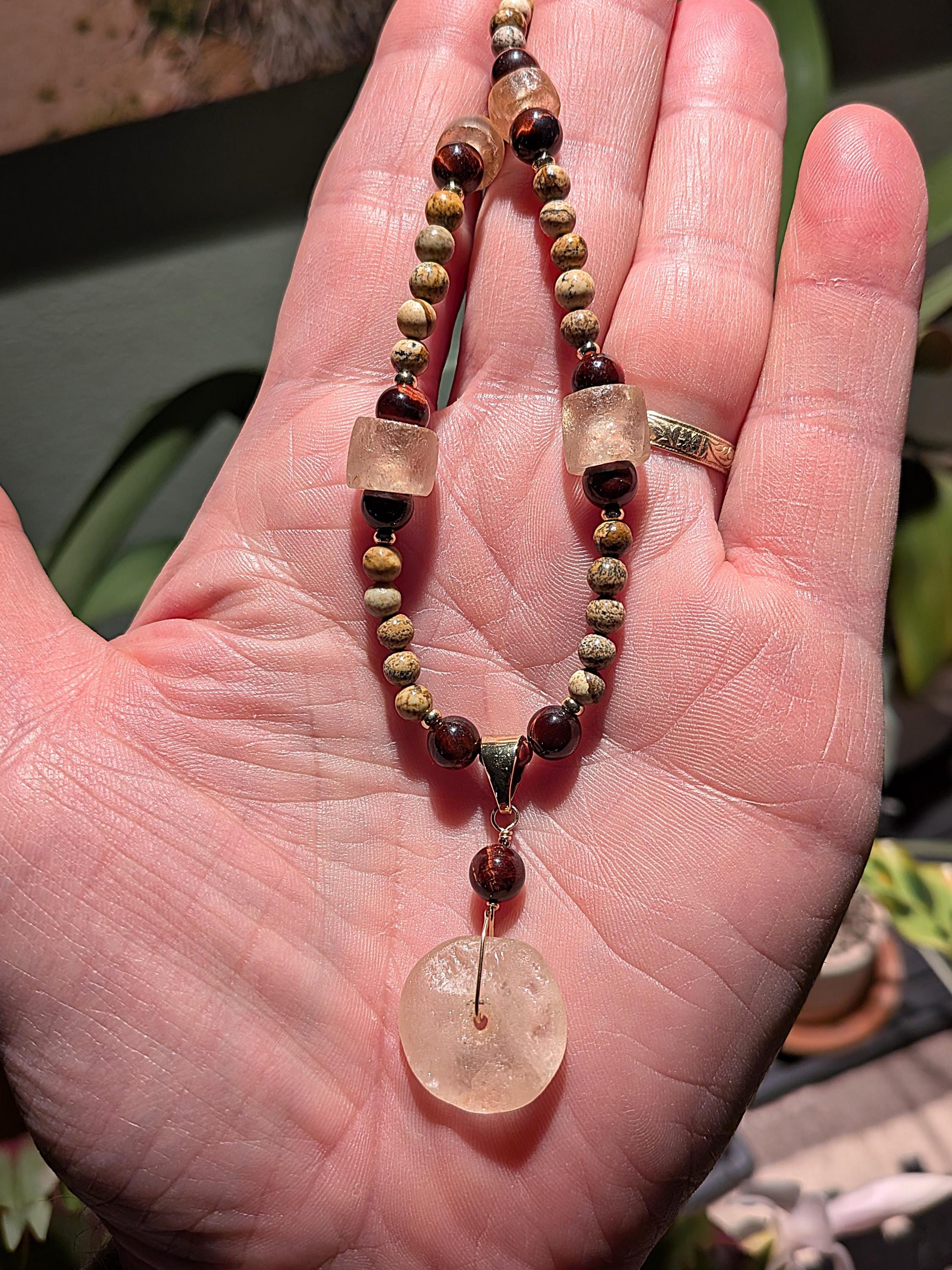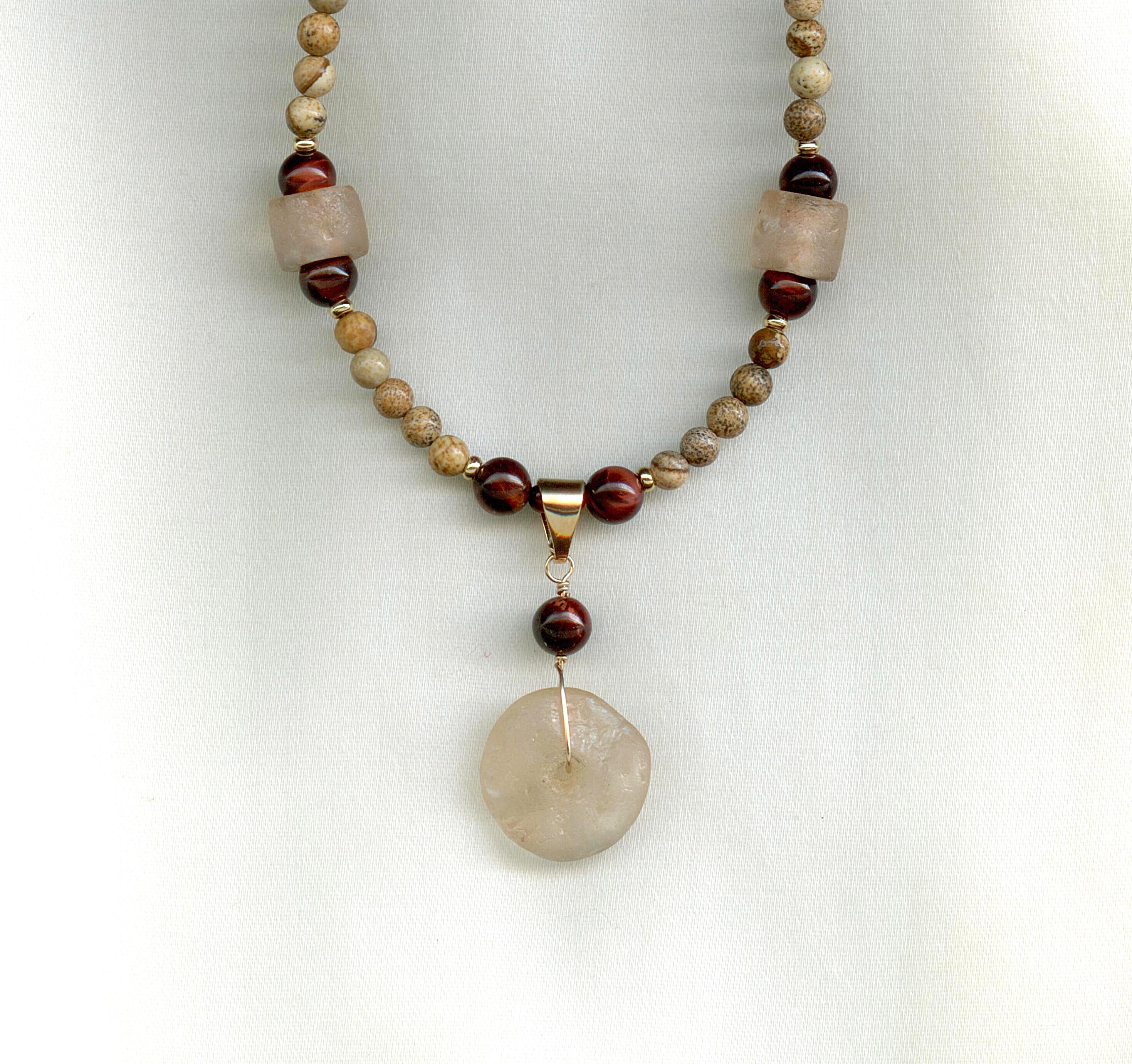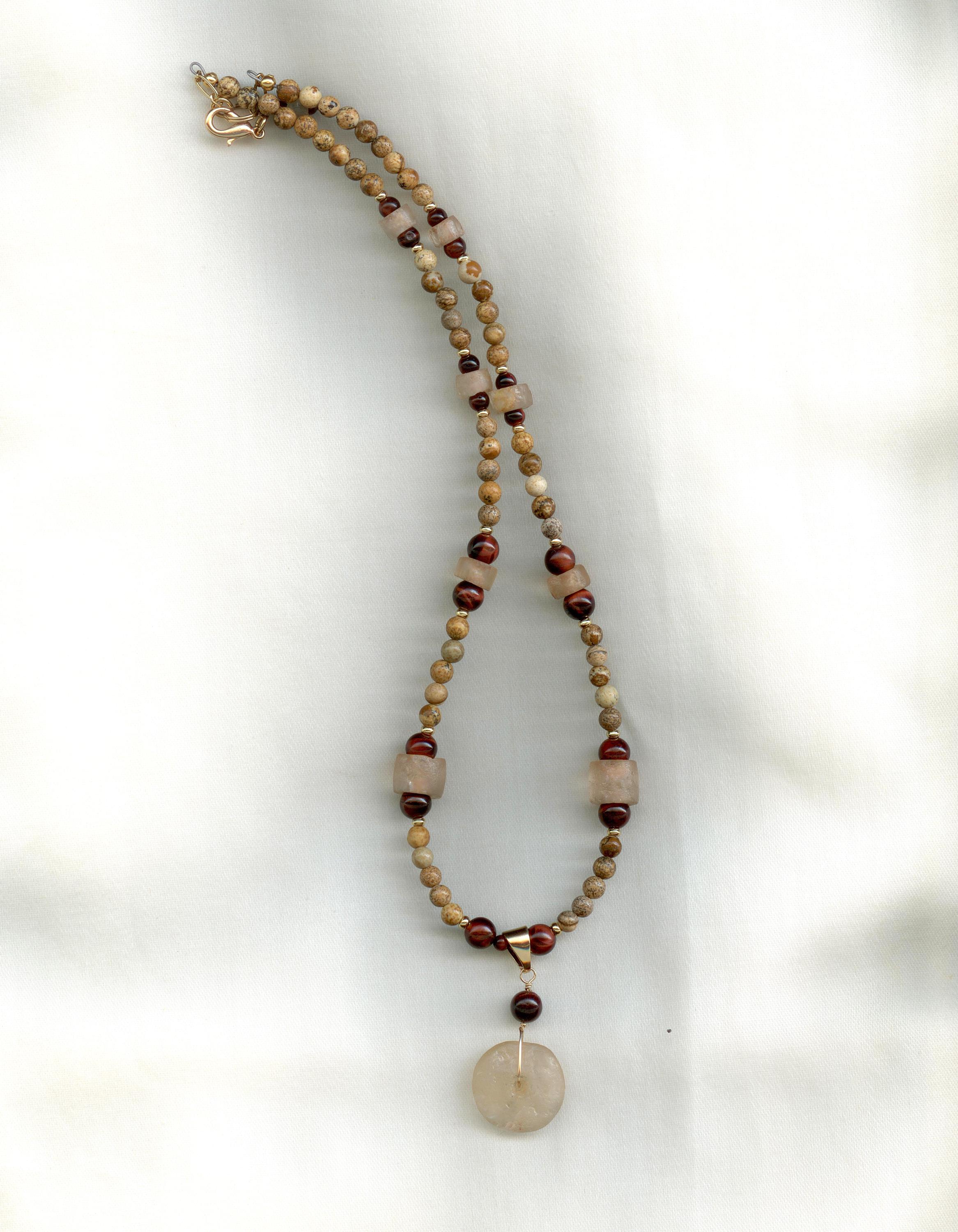 Strung with modern landscape jasper, red tiger eye and gold-filled beads, wire and bail. The chain and clasp are PermaGold, a highly durable 24 kt gold plate. length: 18"