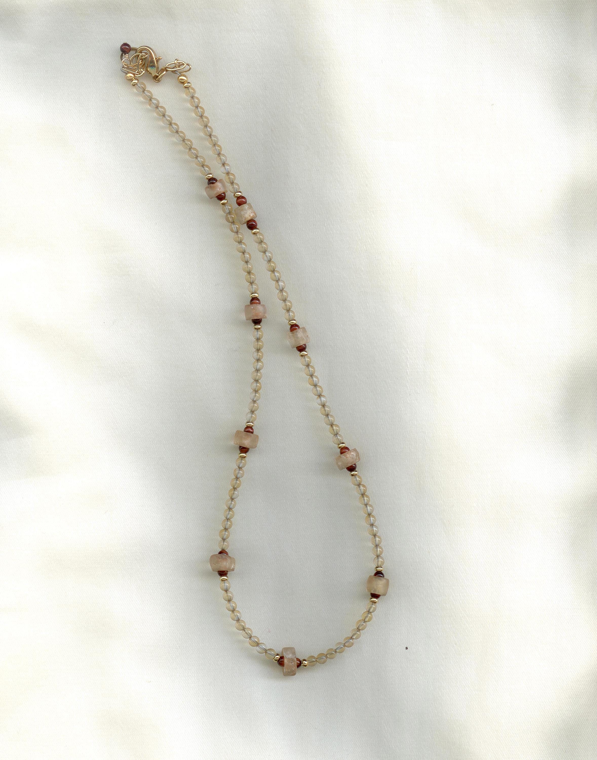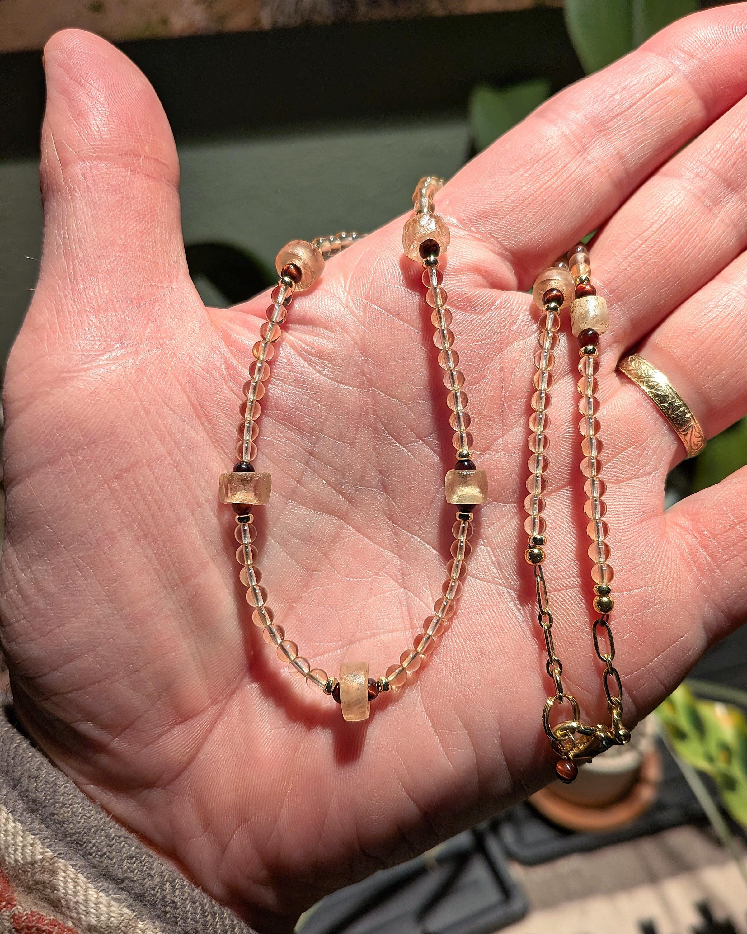 Strung with modern citrine, red tiger eye and gold filled beads. The chain and clasp are PermaGold, a highly durable 24 kt gold plate. Length: 18"