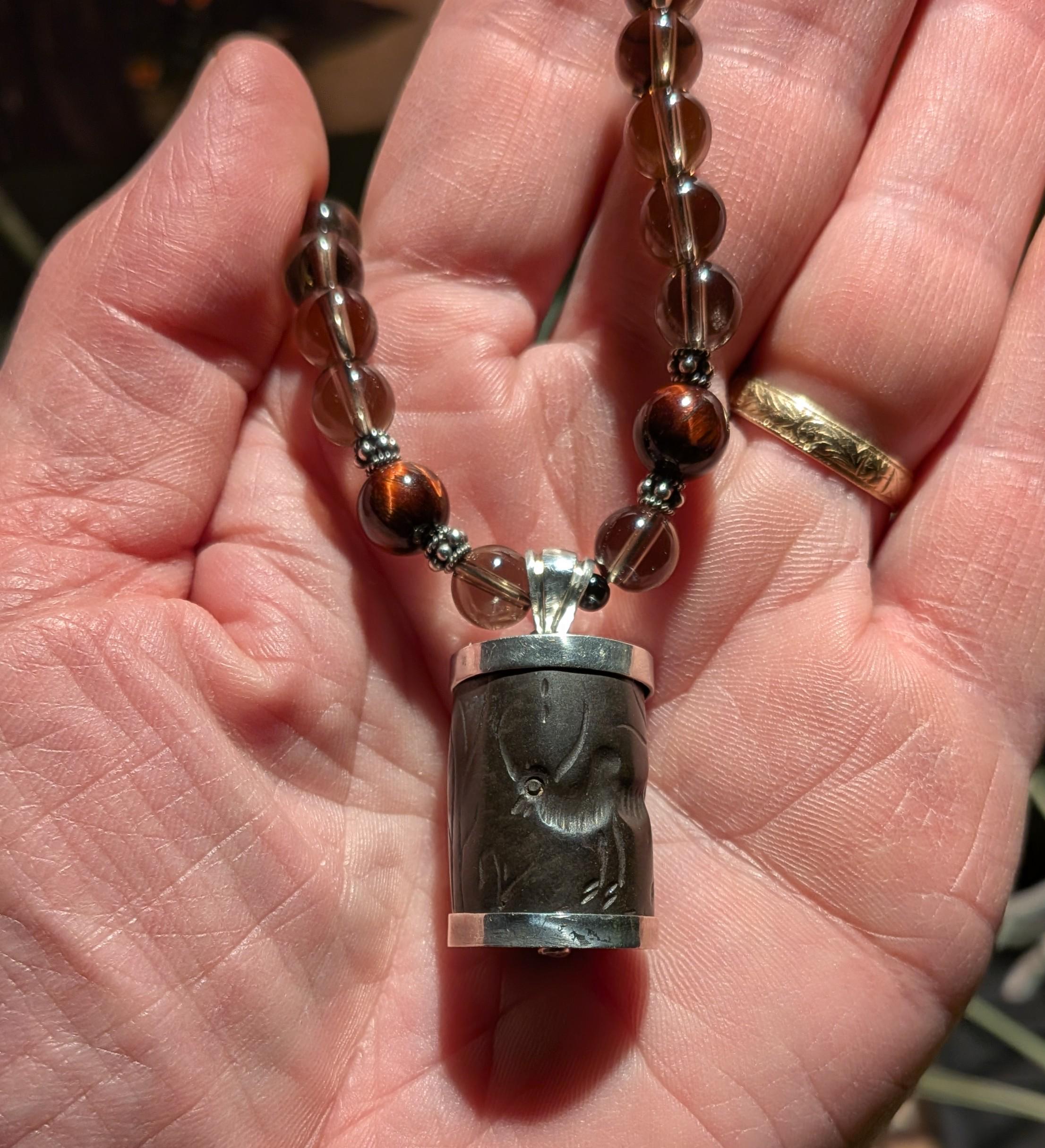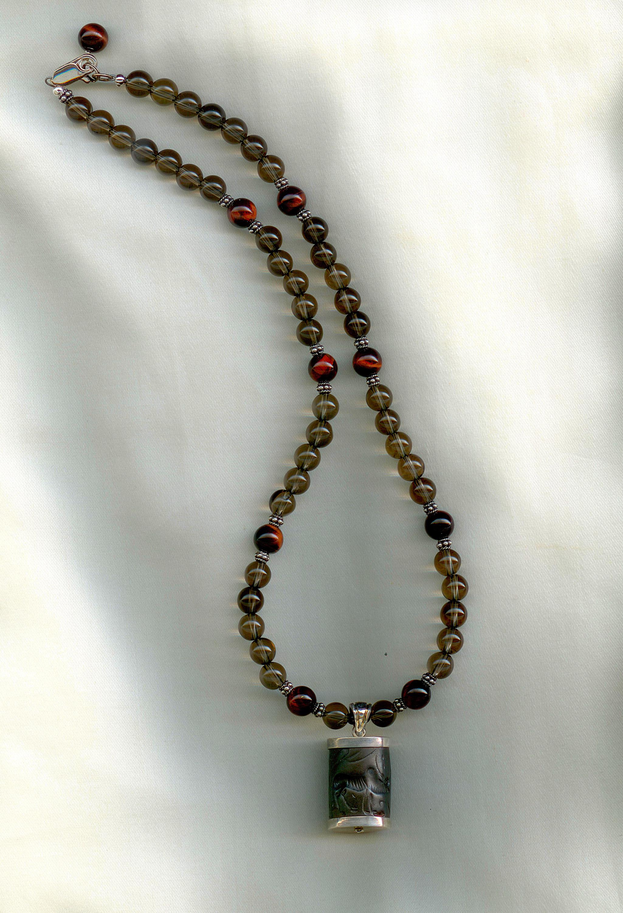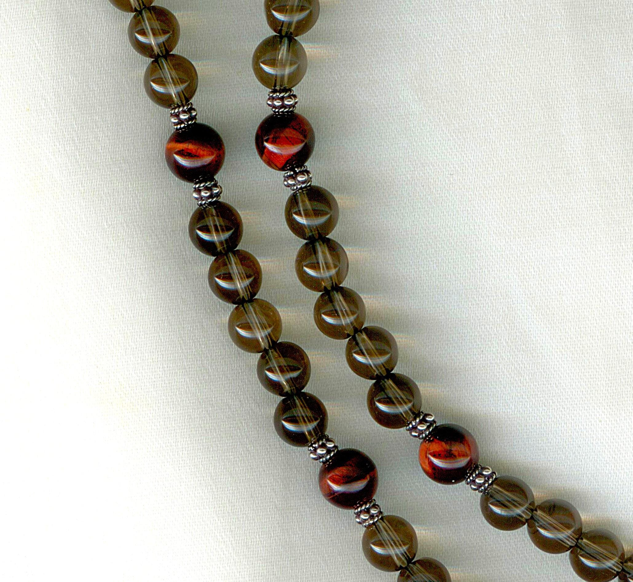 Strung with modern red tiger eye, smoky quartz and oxidized silver beads. Length: 18 3/4"