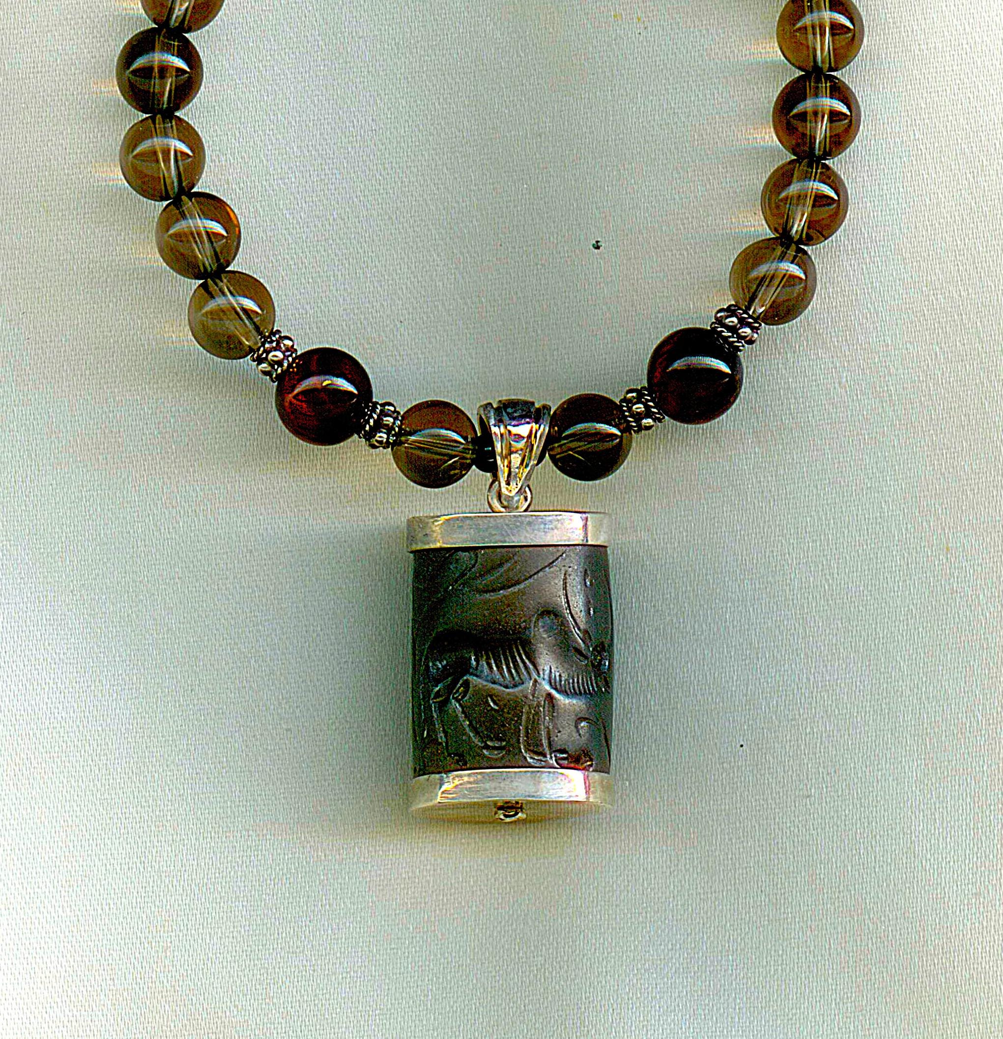 This is a hematite cylinder seal from the Achaemenid Empire which flourished from 550 to 330 BCE in the ancient Near East. It depicts two bulls that are very beautifully carved. It always amazes me how ancient peoples could carve such hard stone with such delicate detail.