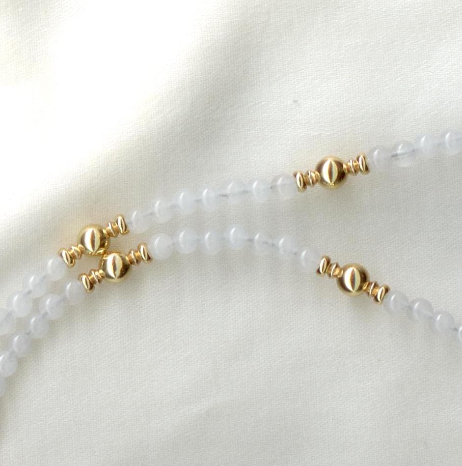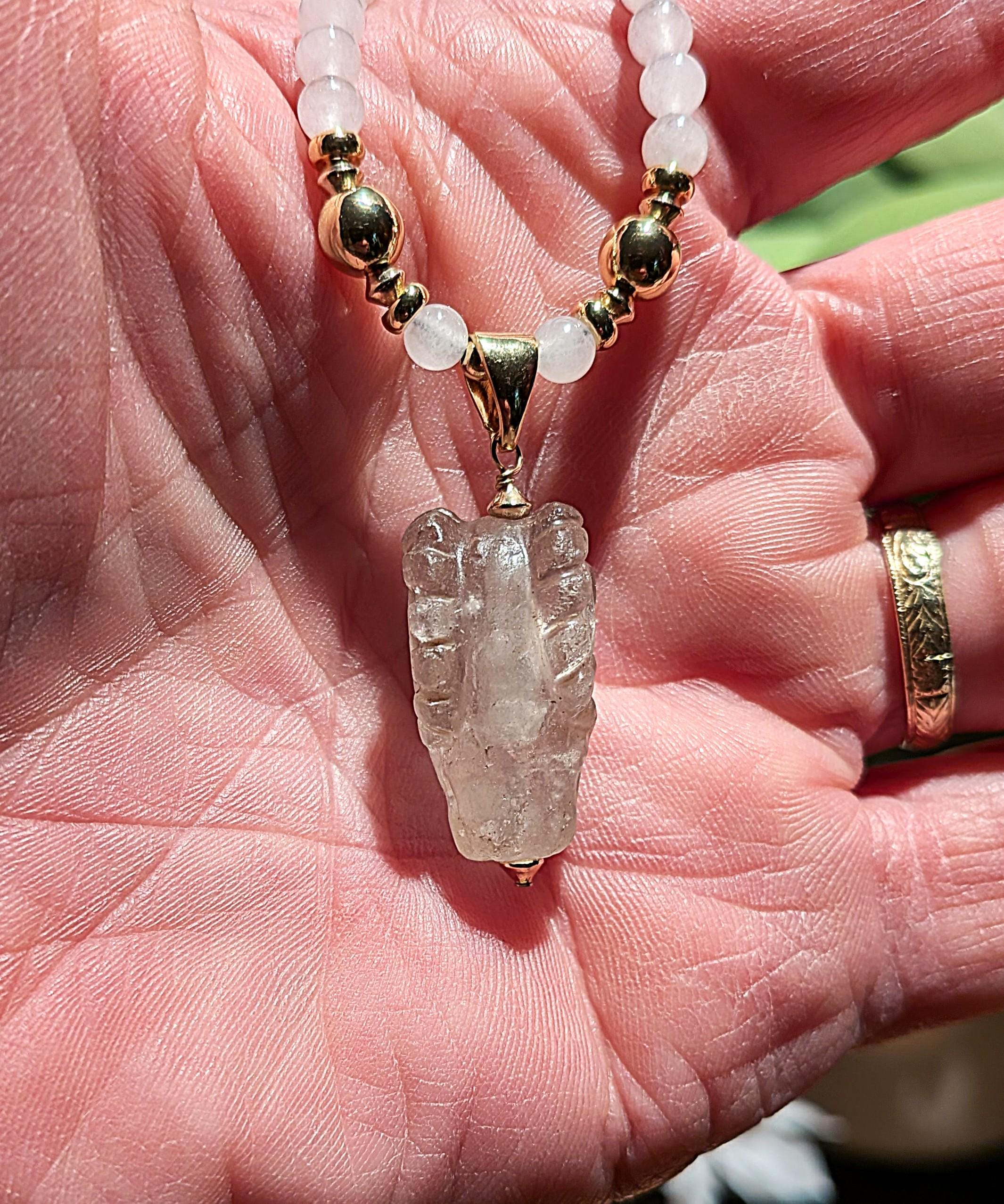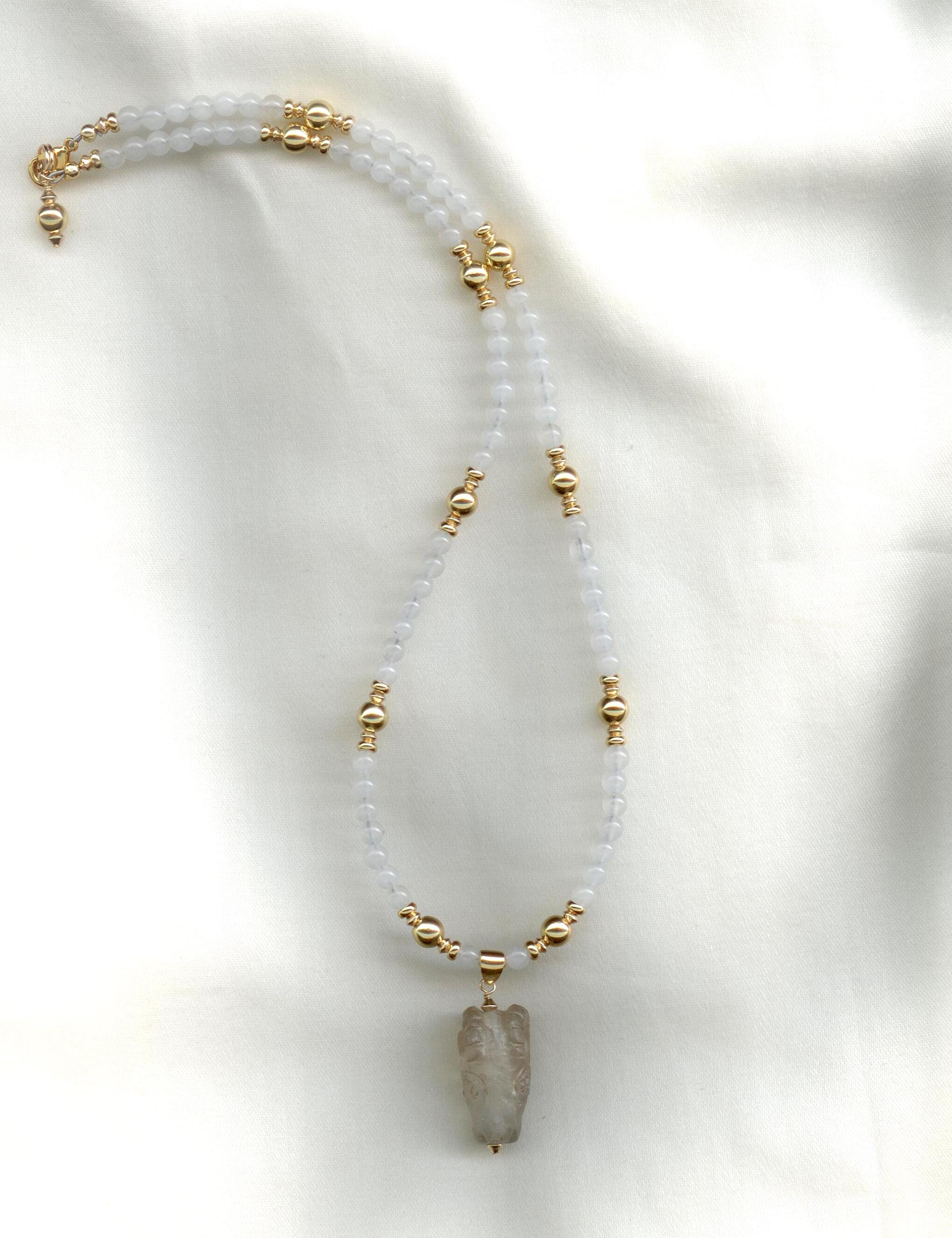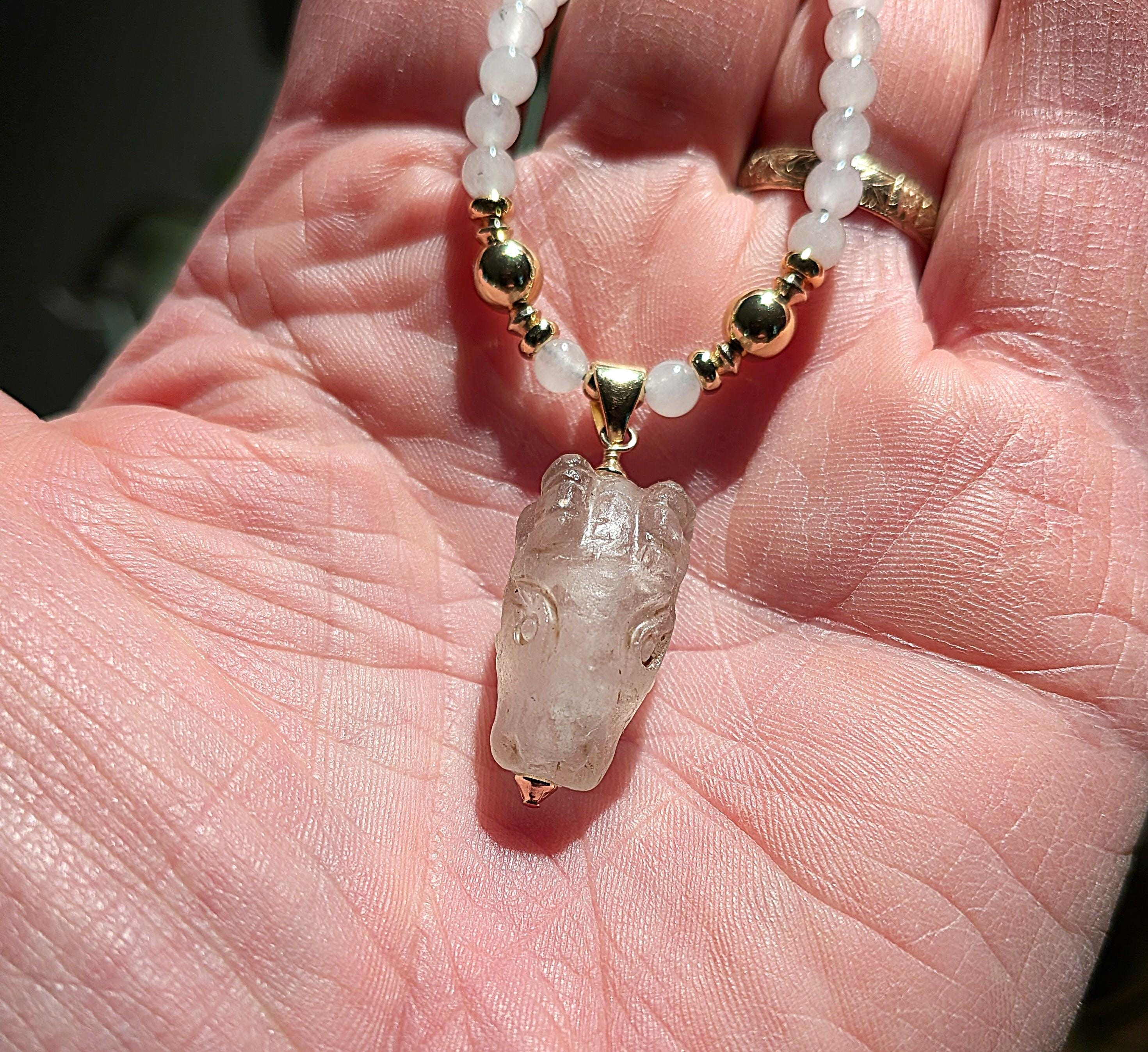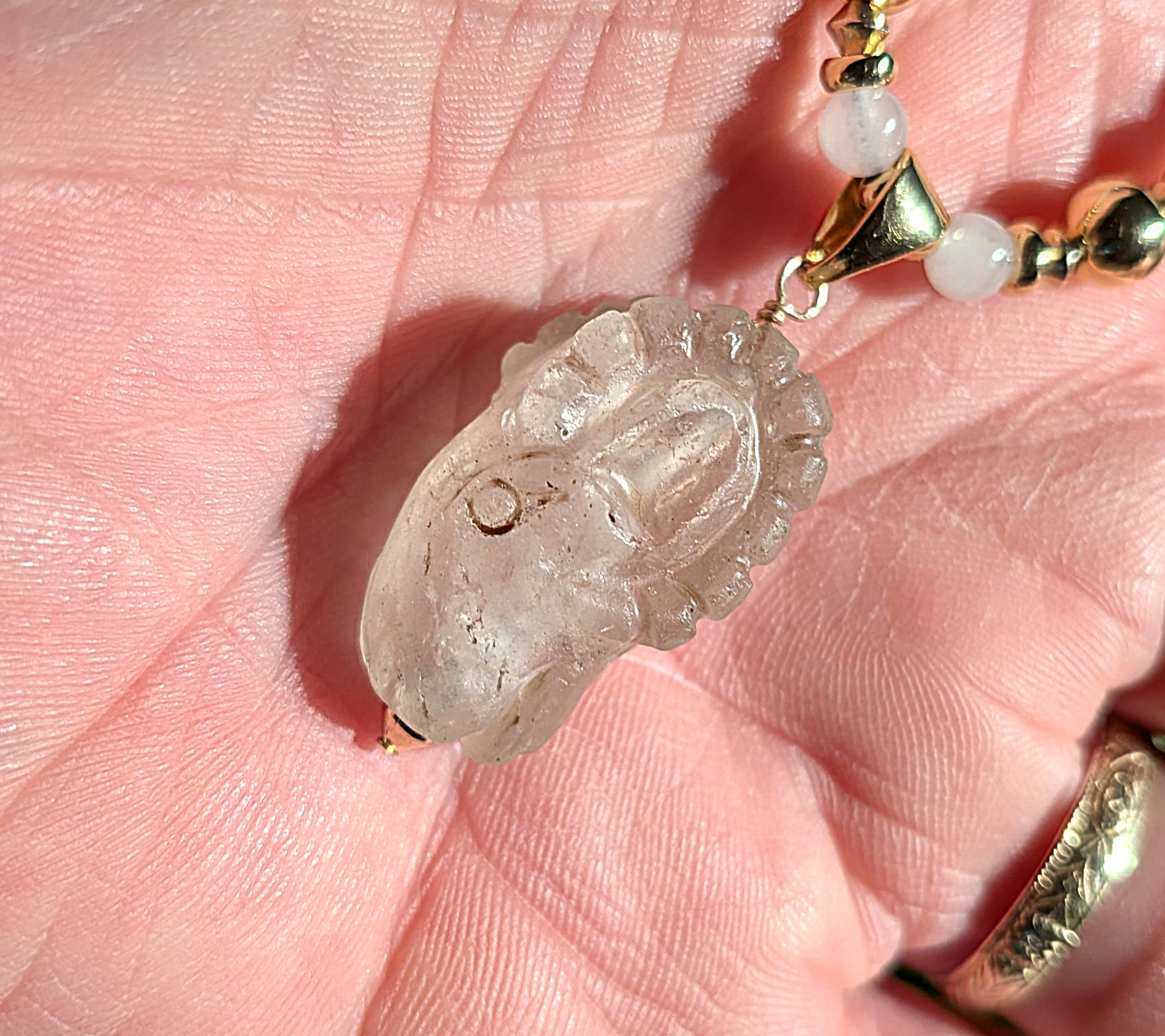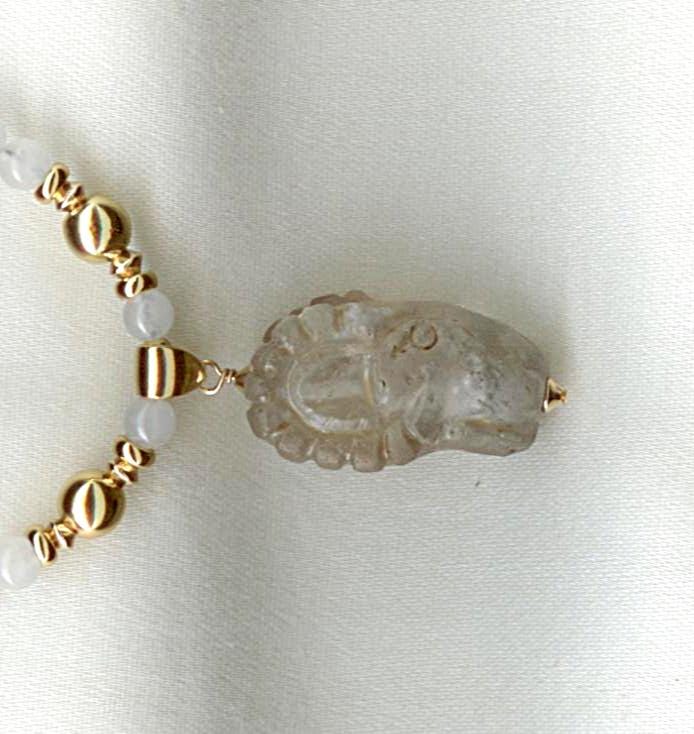 Near Eastern ram's head pendant, exquisitely carved from quartz crystal. Probably first millennium BC.Strung with moonstone beads and gold filled beads and findings. Length: 18.5"
