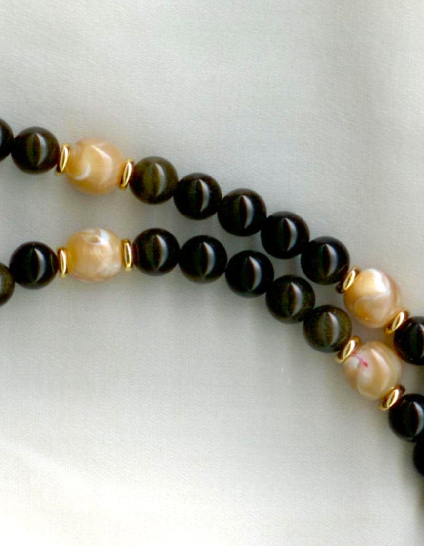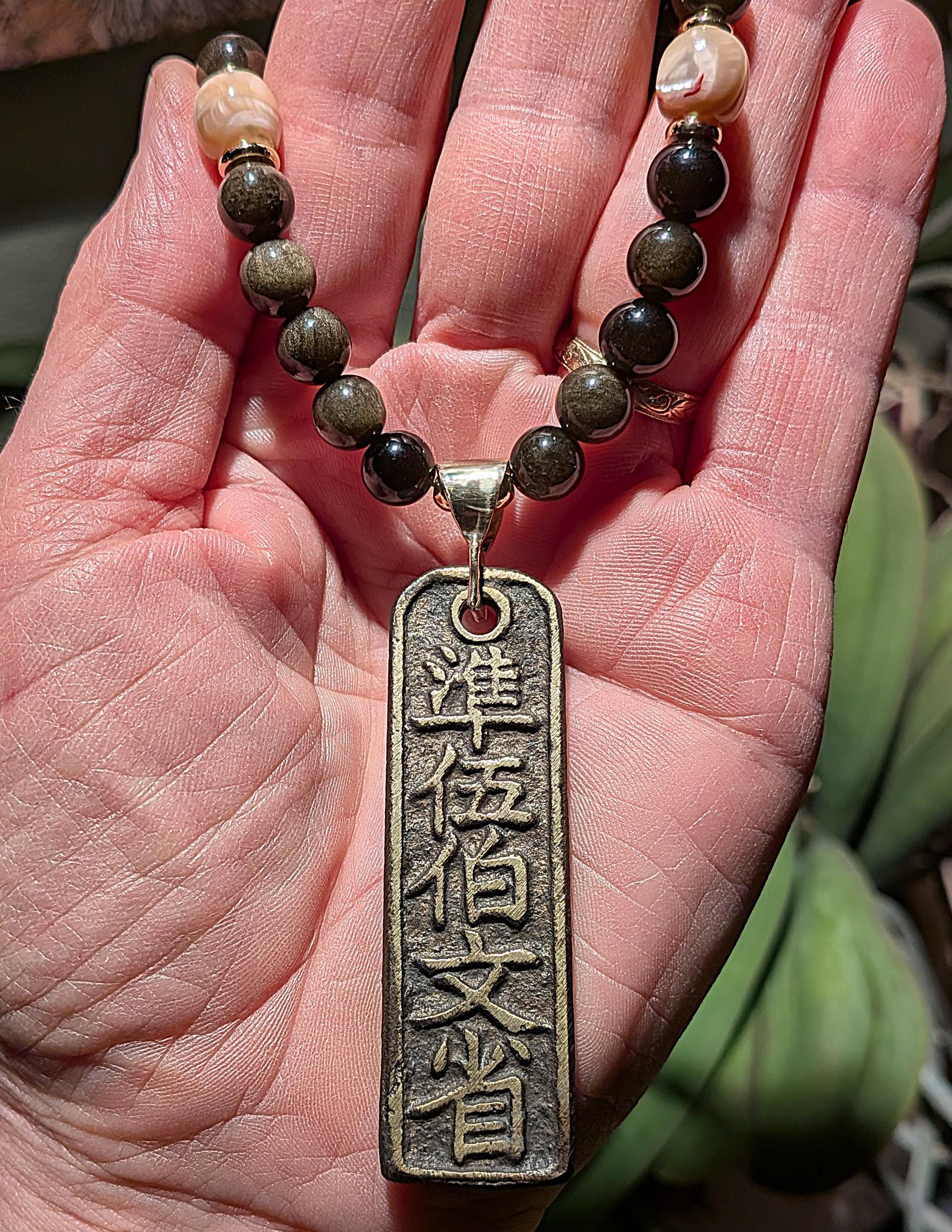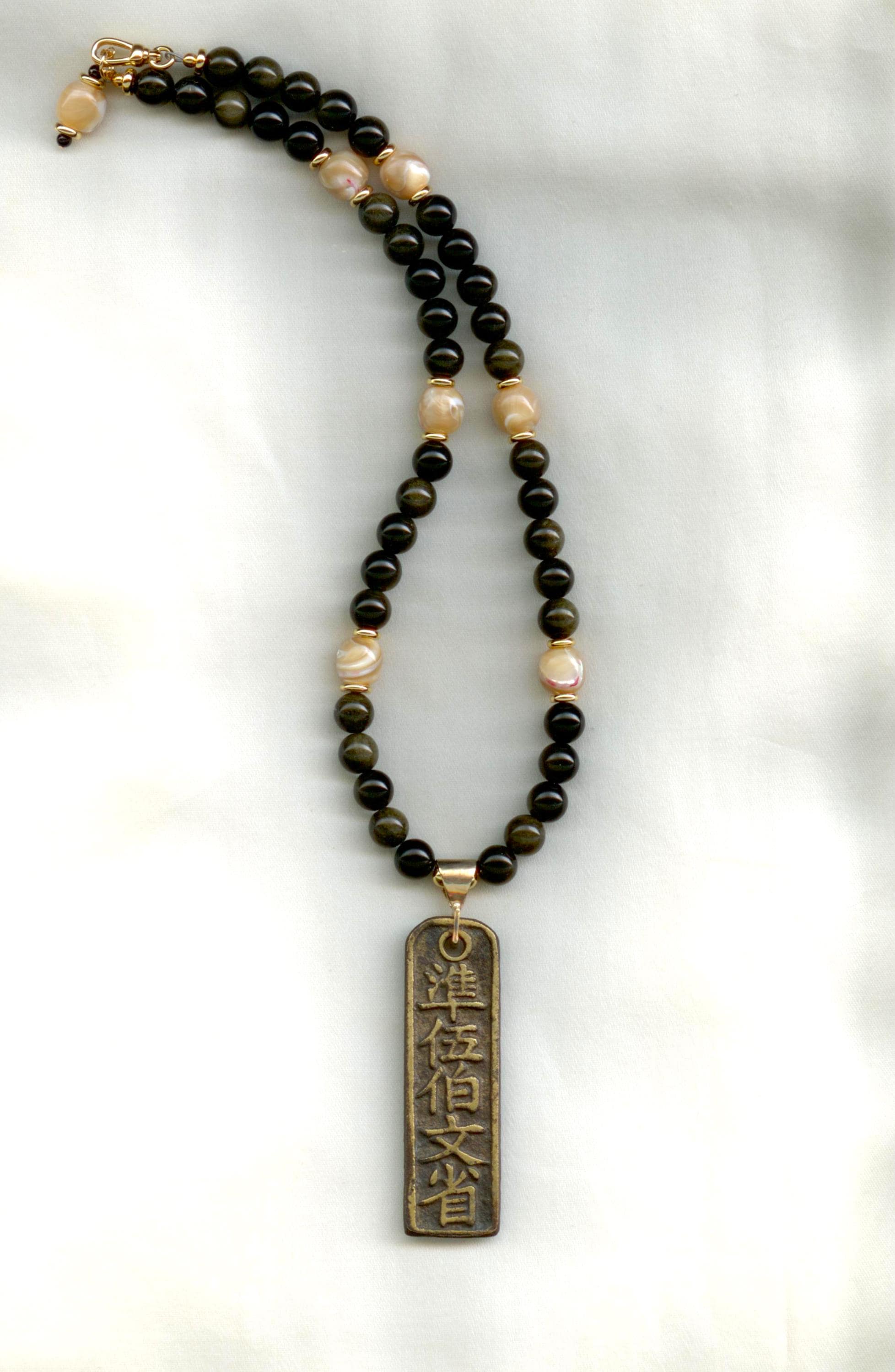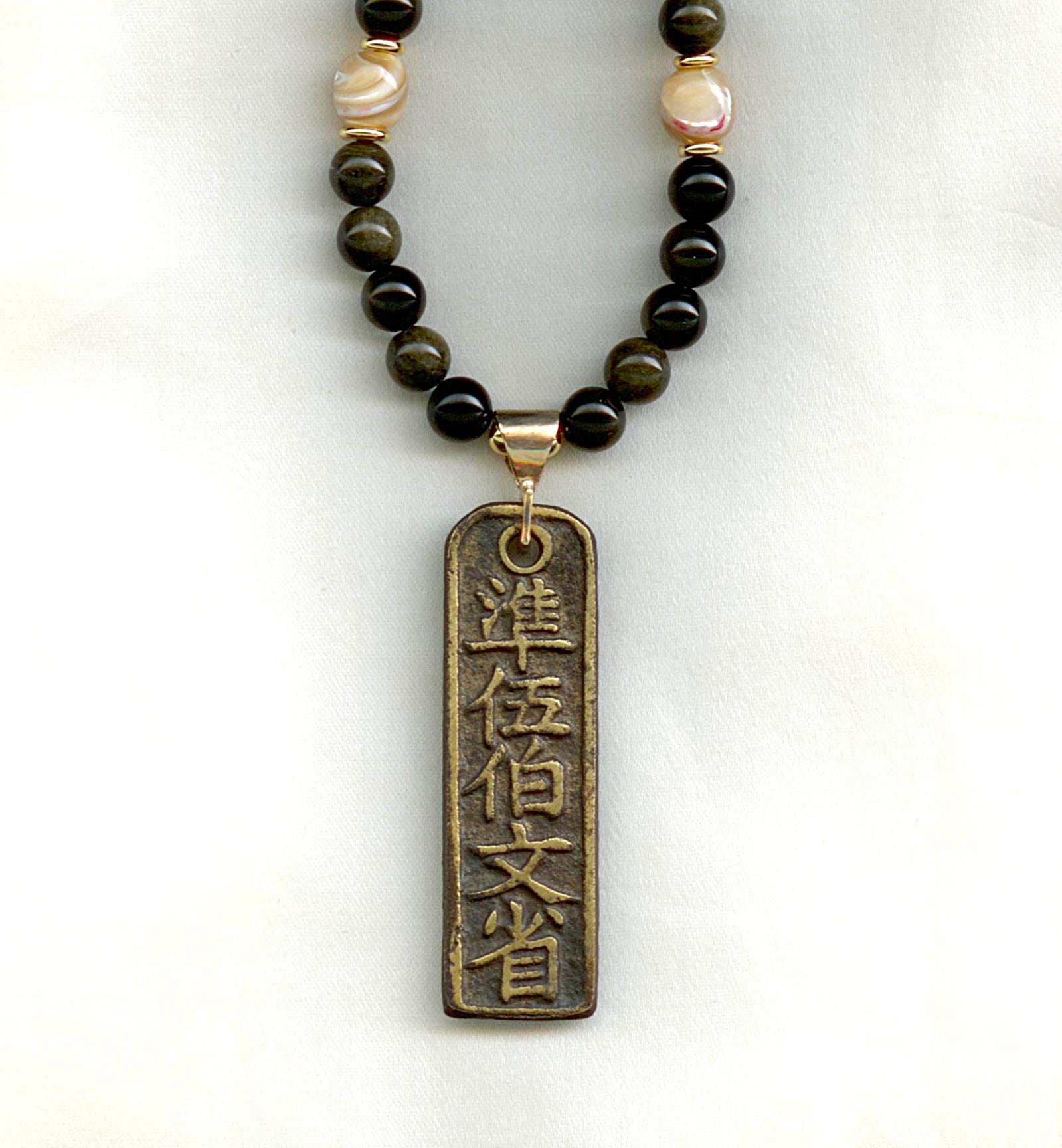 Ancient bronze coin from the Wen Lin'an Prefecture of ancient China, 960 to 1279 AD.The setting is 14 kt gold. Strung with modern gold-flash obsidian, mother-of-pearl and gold-filled beads. Length:18"