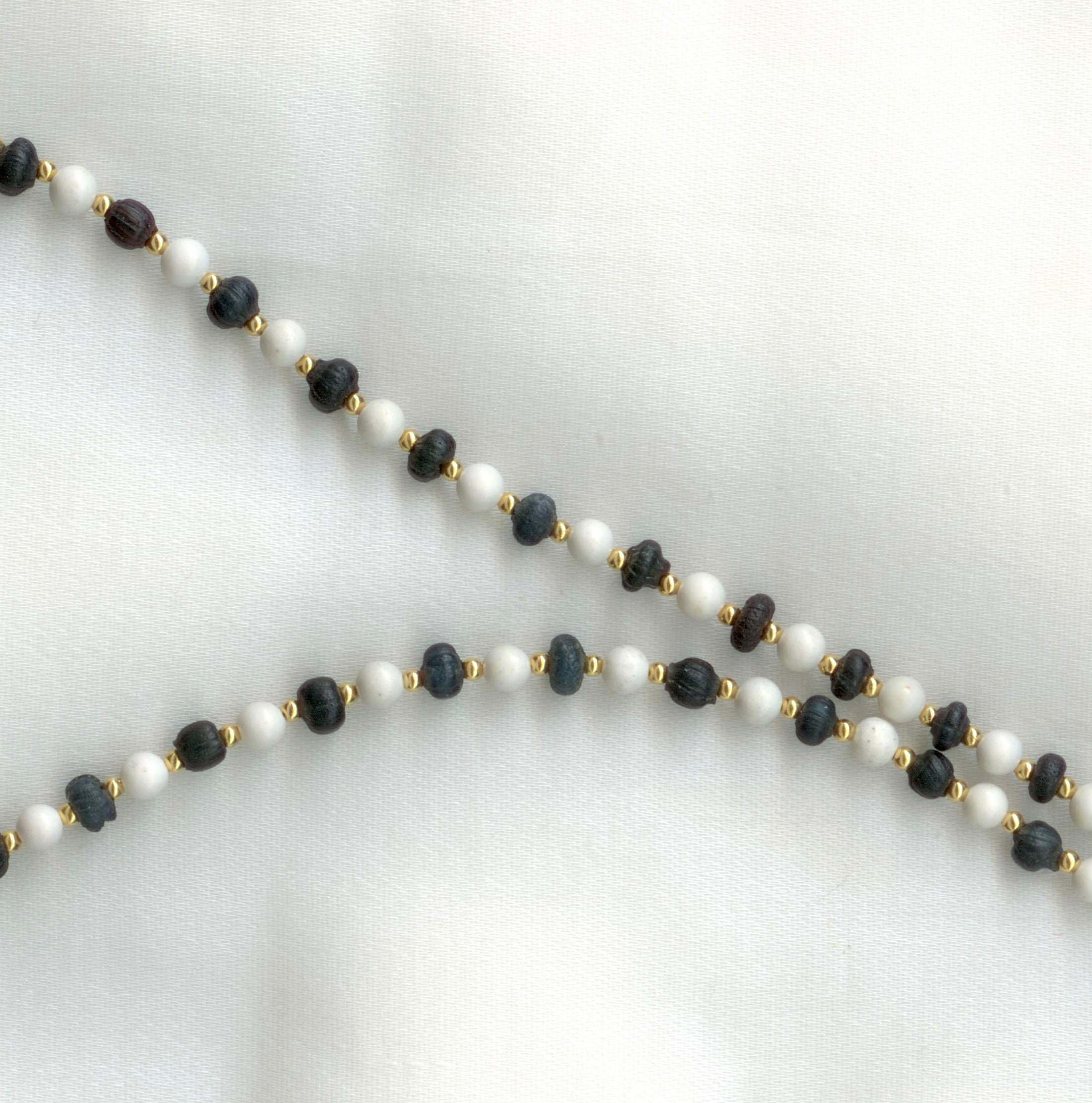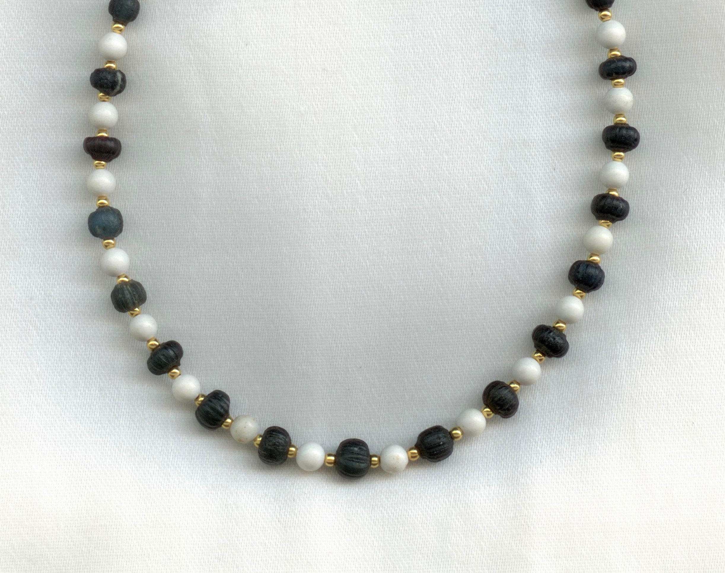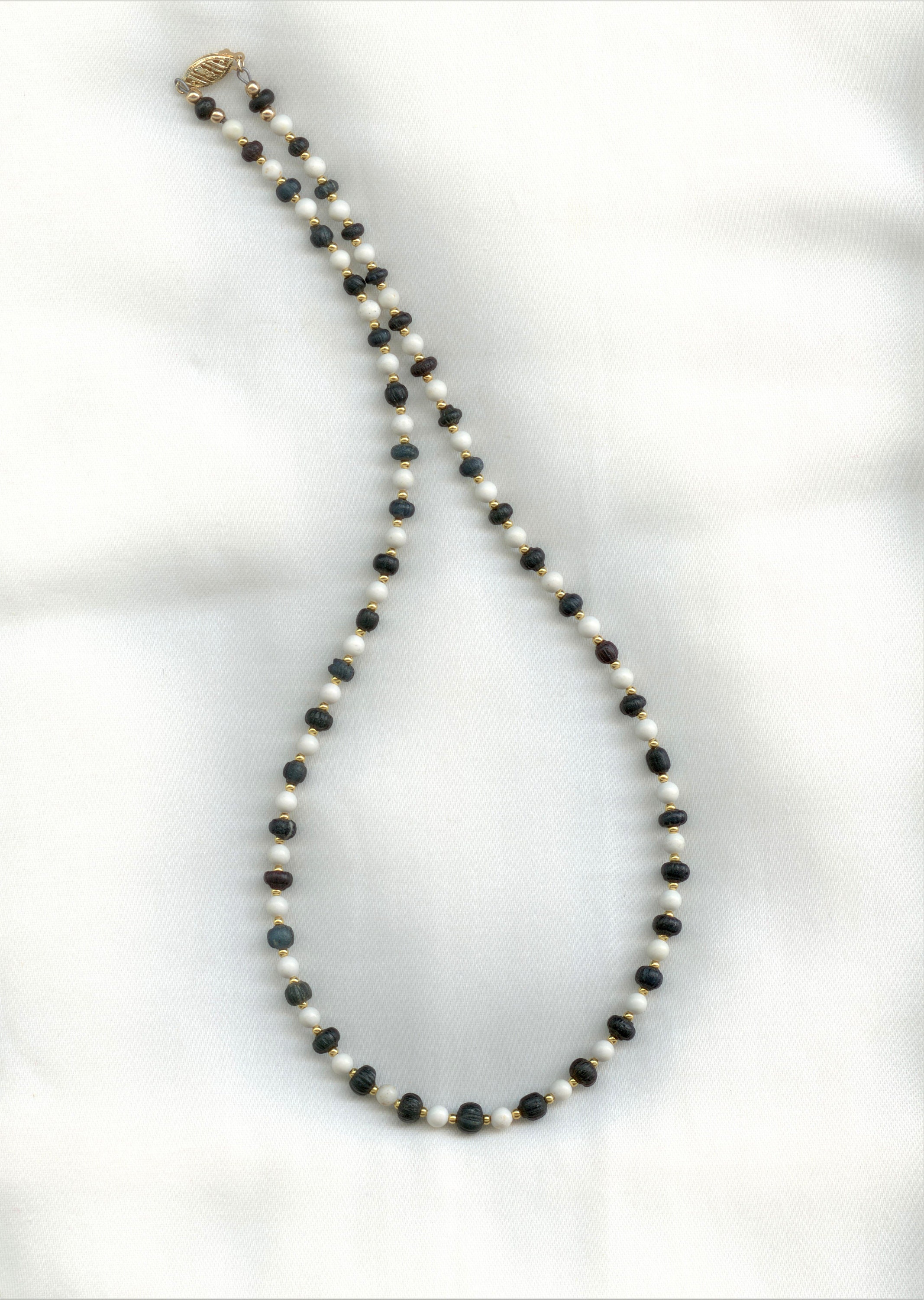 The dark beads in this necklace are from the Roman Era and date from roughly 100 to 400 AD. They are hollow and have a delicate patterning on the exterior.Strung with modern howlite and brass beads. The clasp is 14 kt gold.