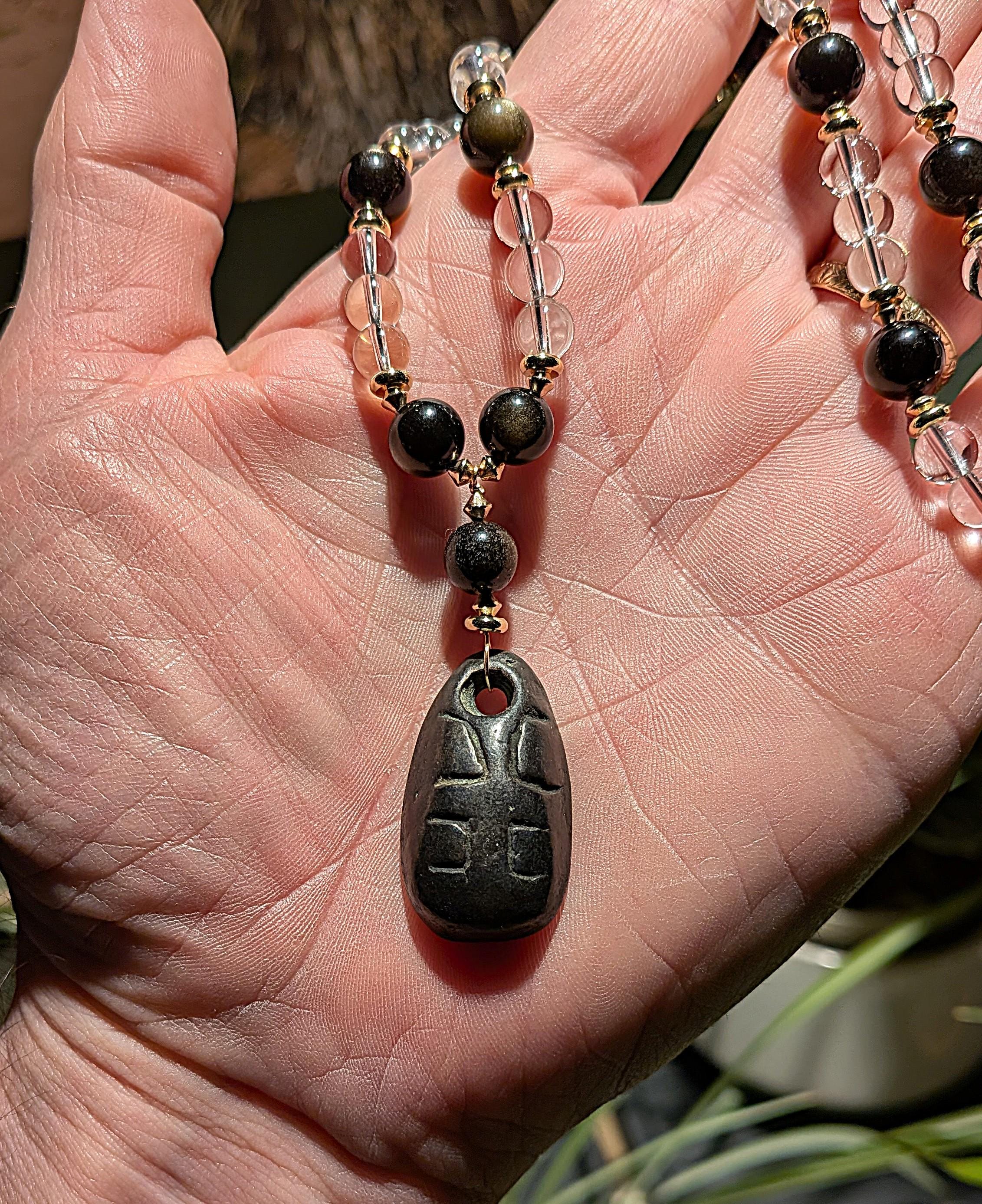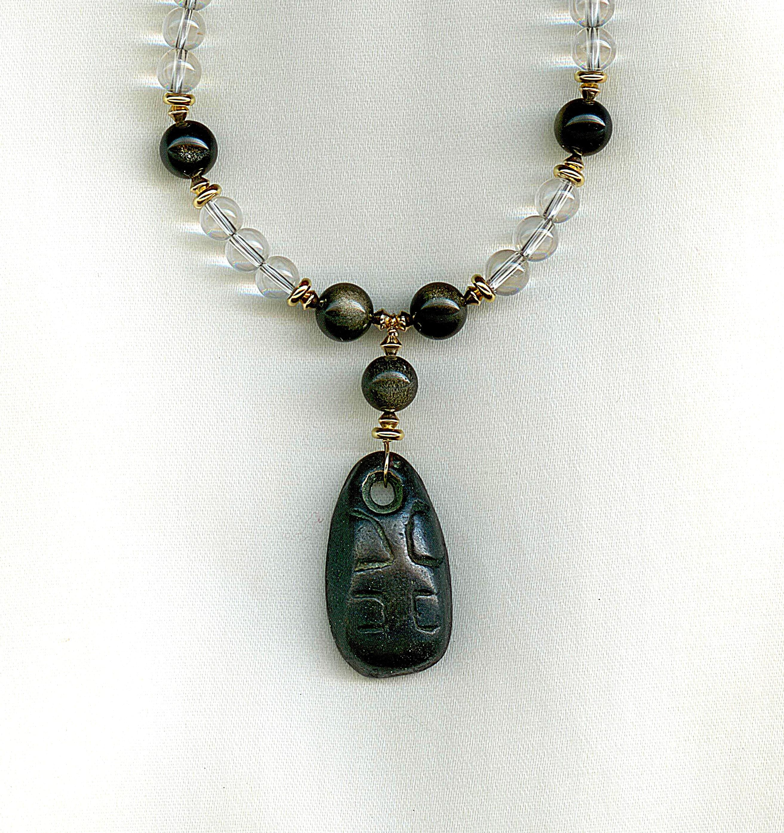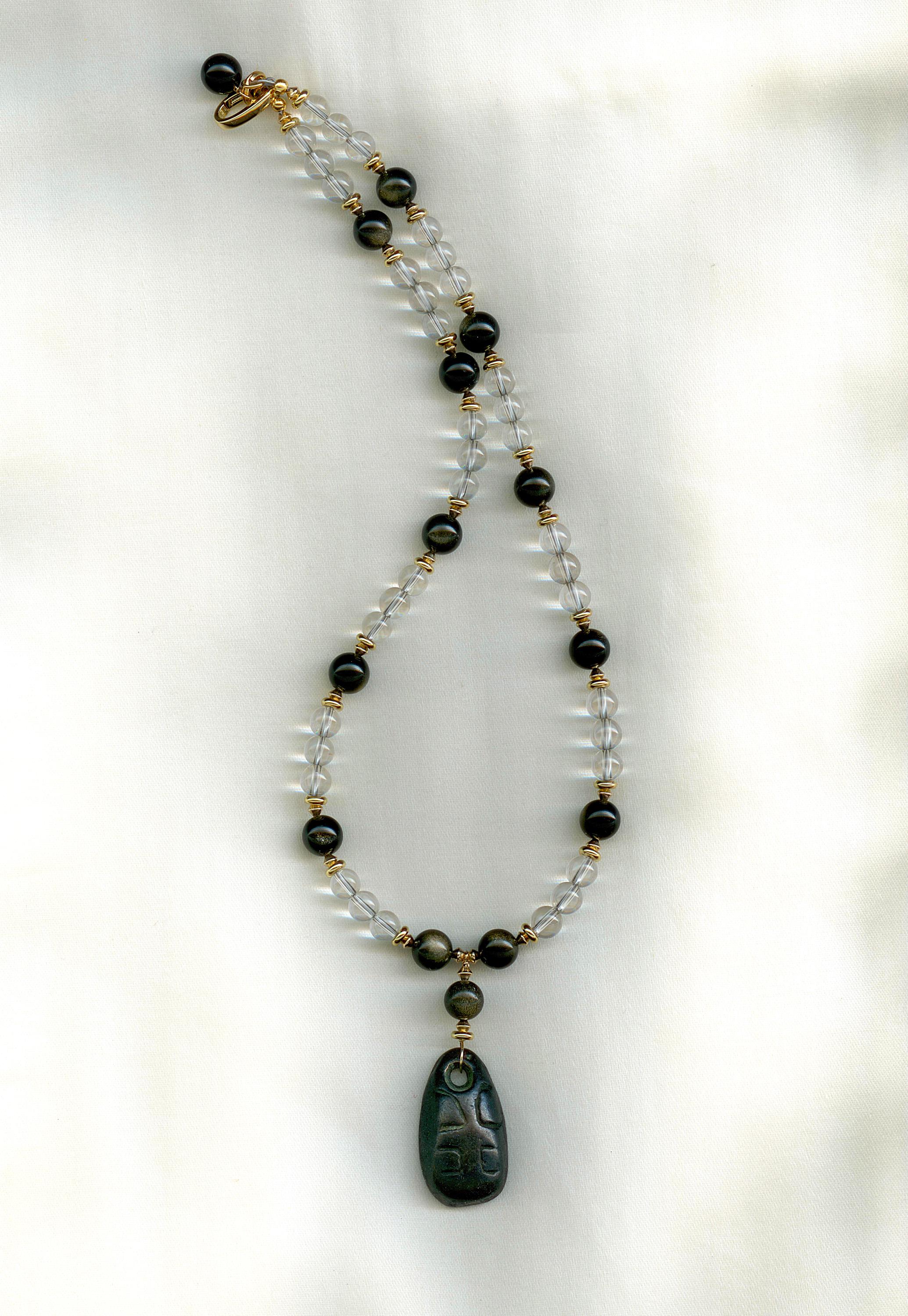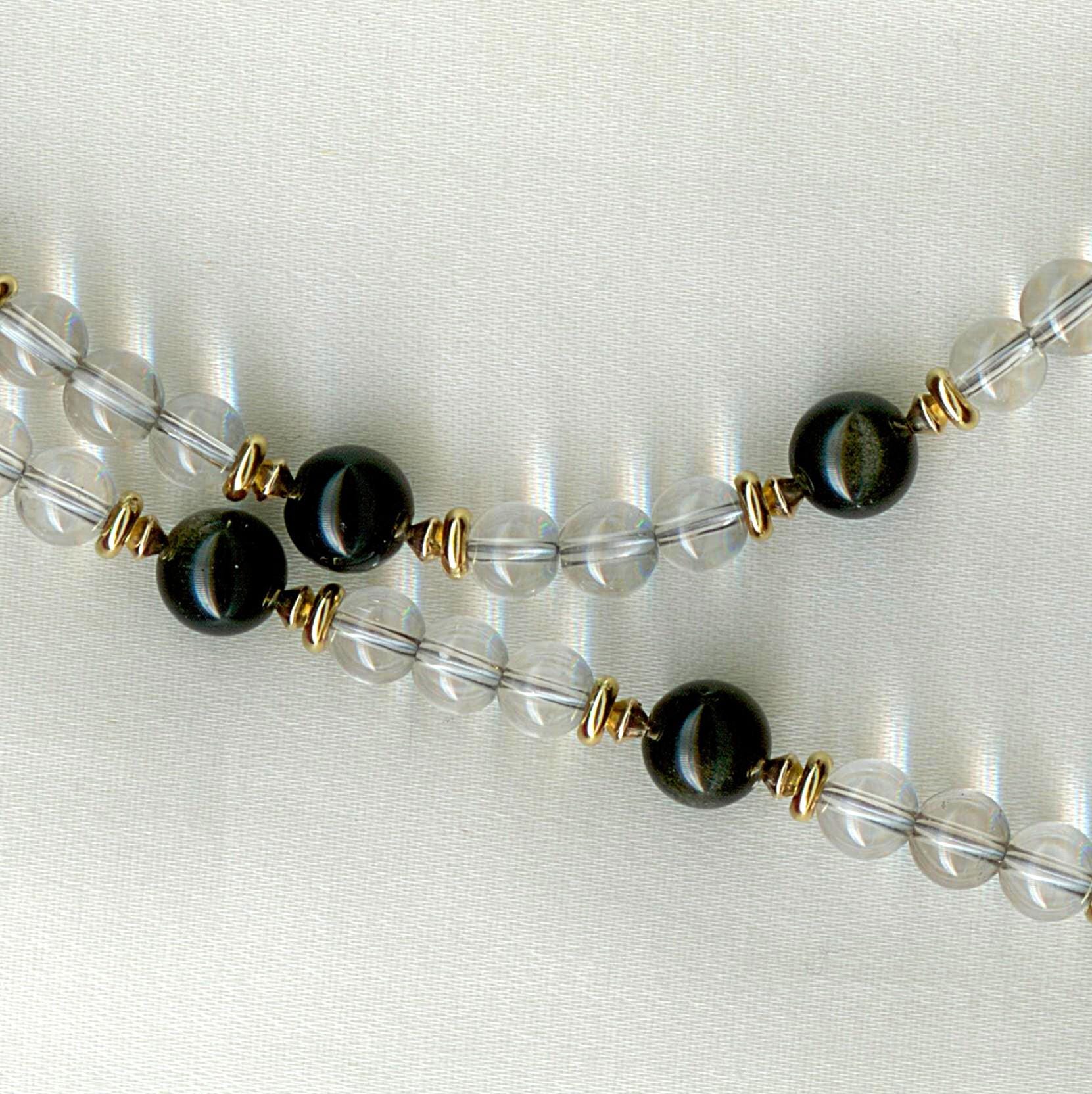 Strung with modern quartz, gold flash obsidian and gold filled beads. Length: 17.5 "