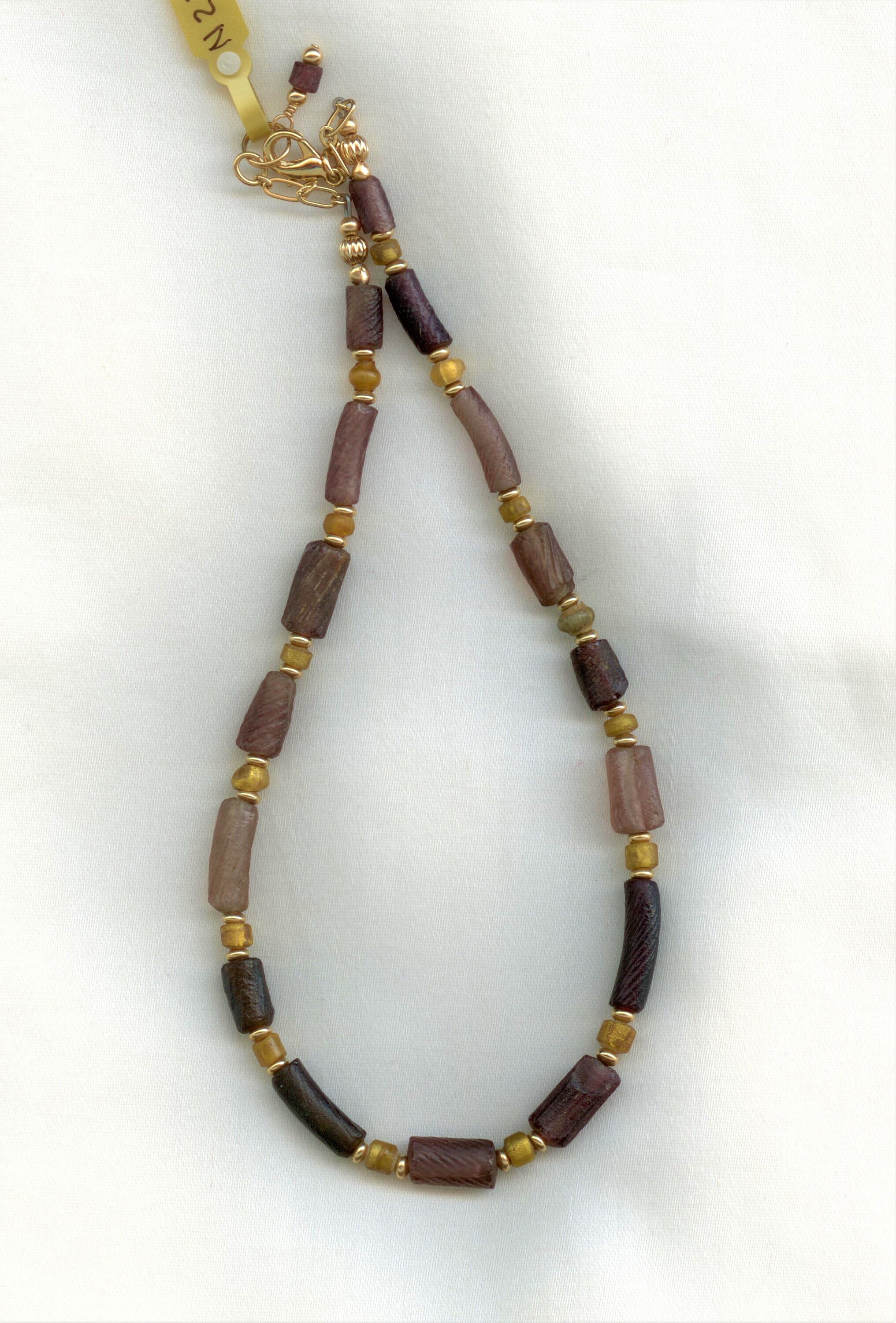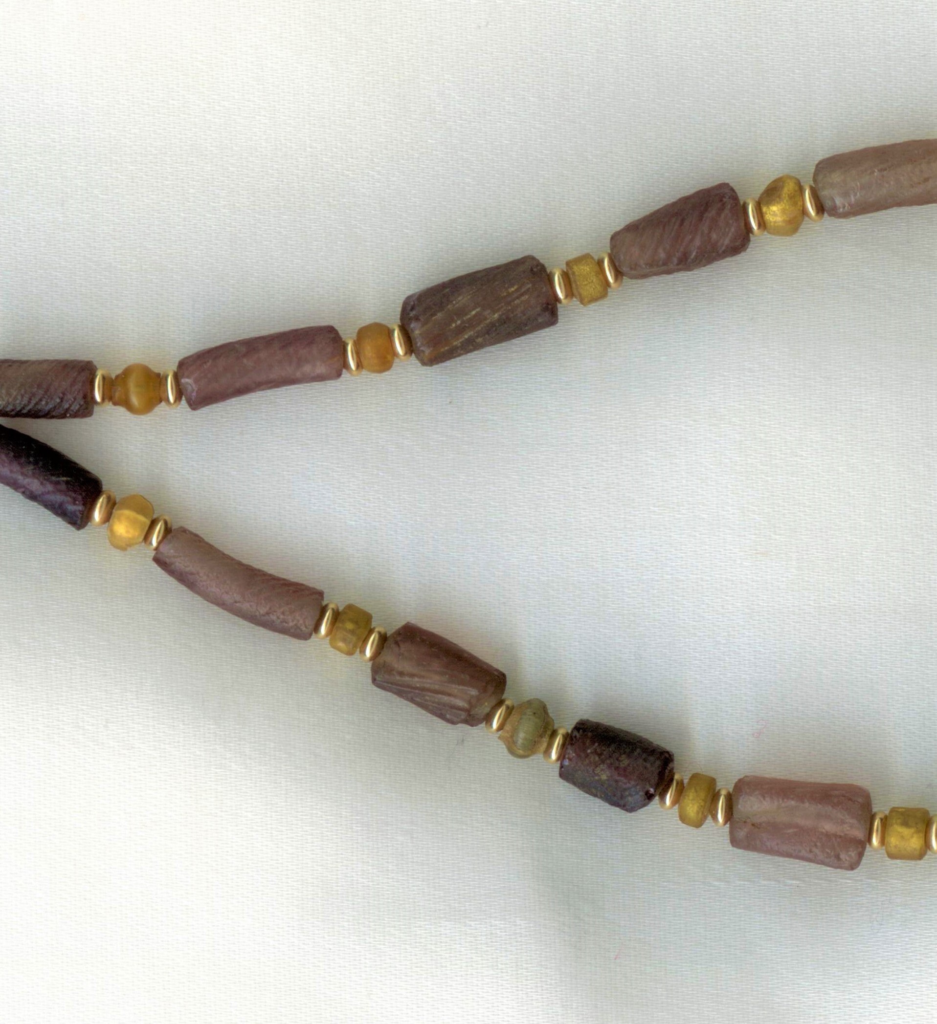 This necklace is made with fragments of Roman Era glass bracelets that have been refashioned into beads. The small gold beads are often called “sandwich” beads because they are made by placing a layer of gold foil between layers of glass to construct the bead. These are quite rare and beautiful.
